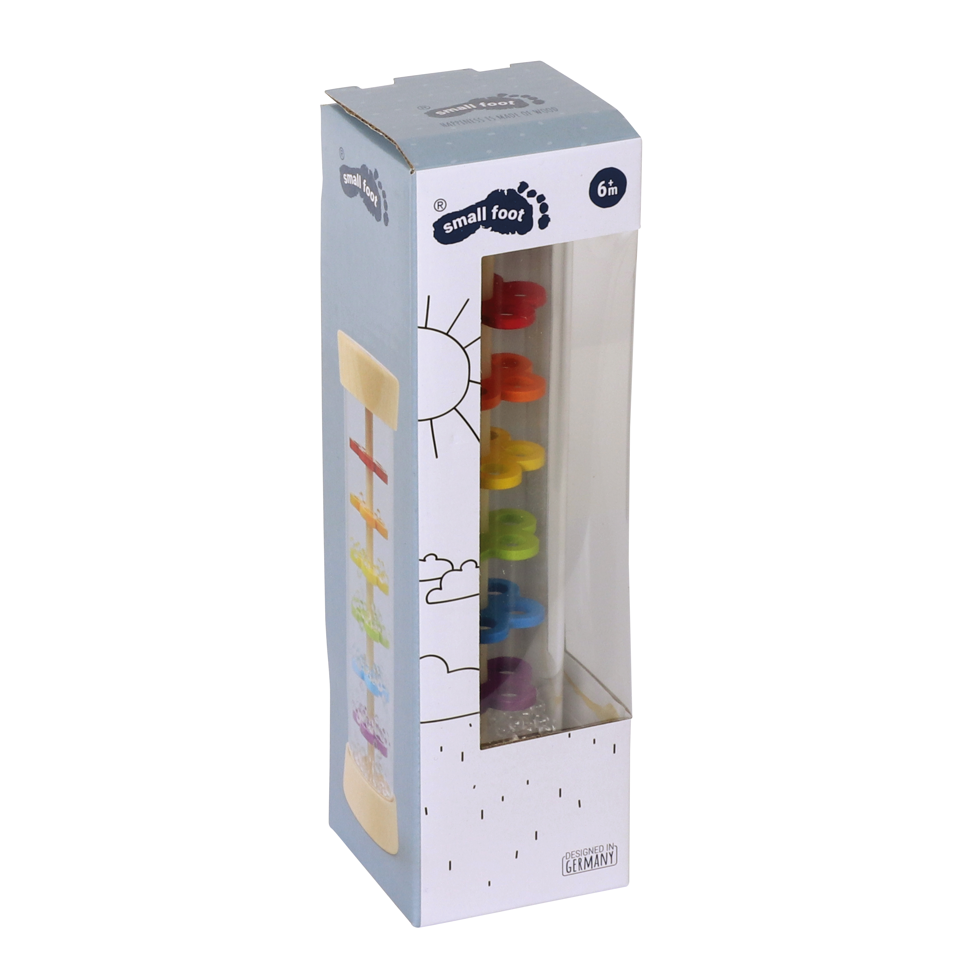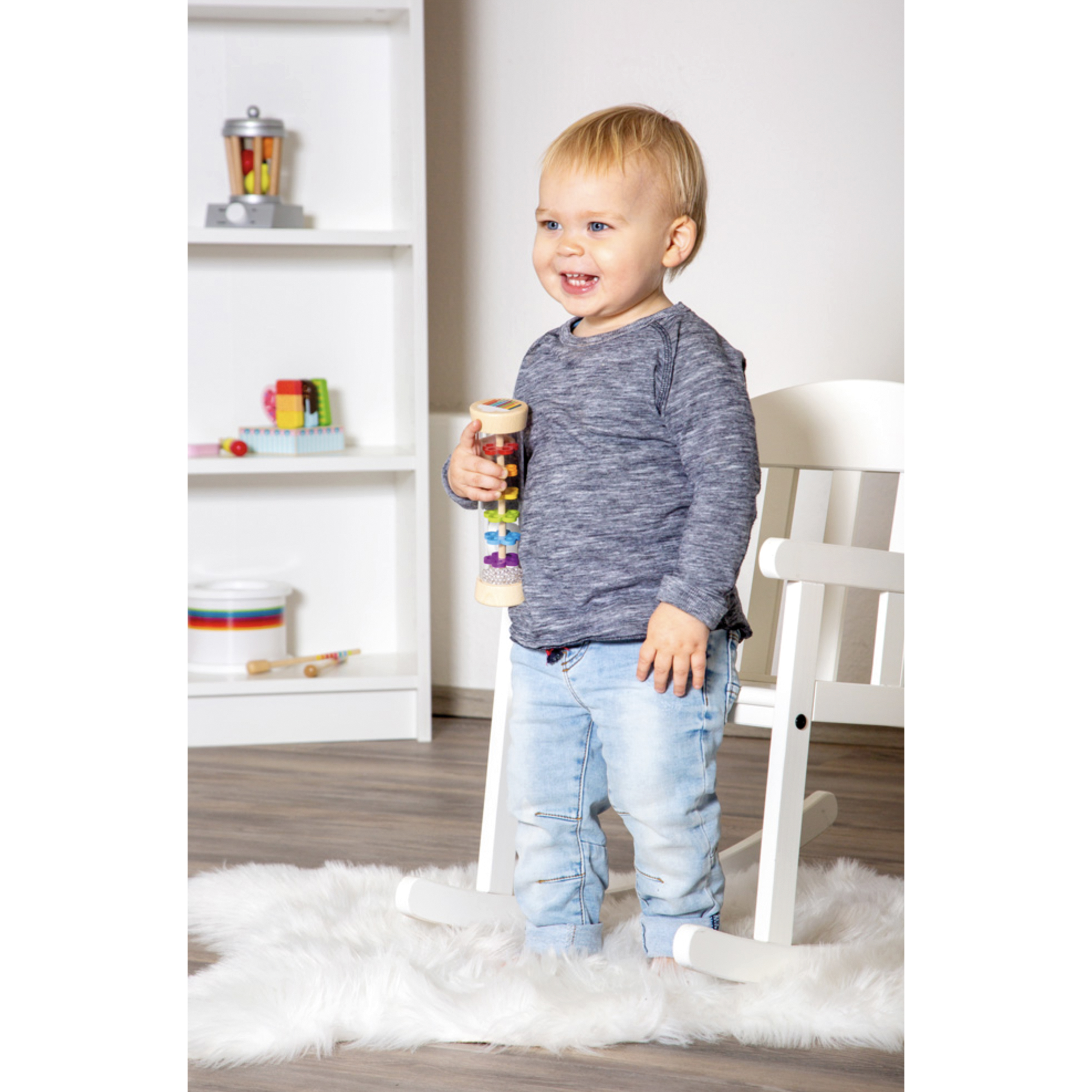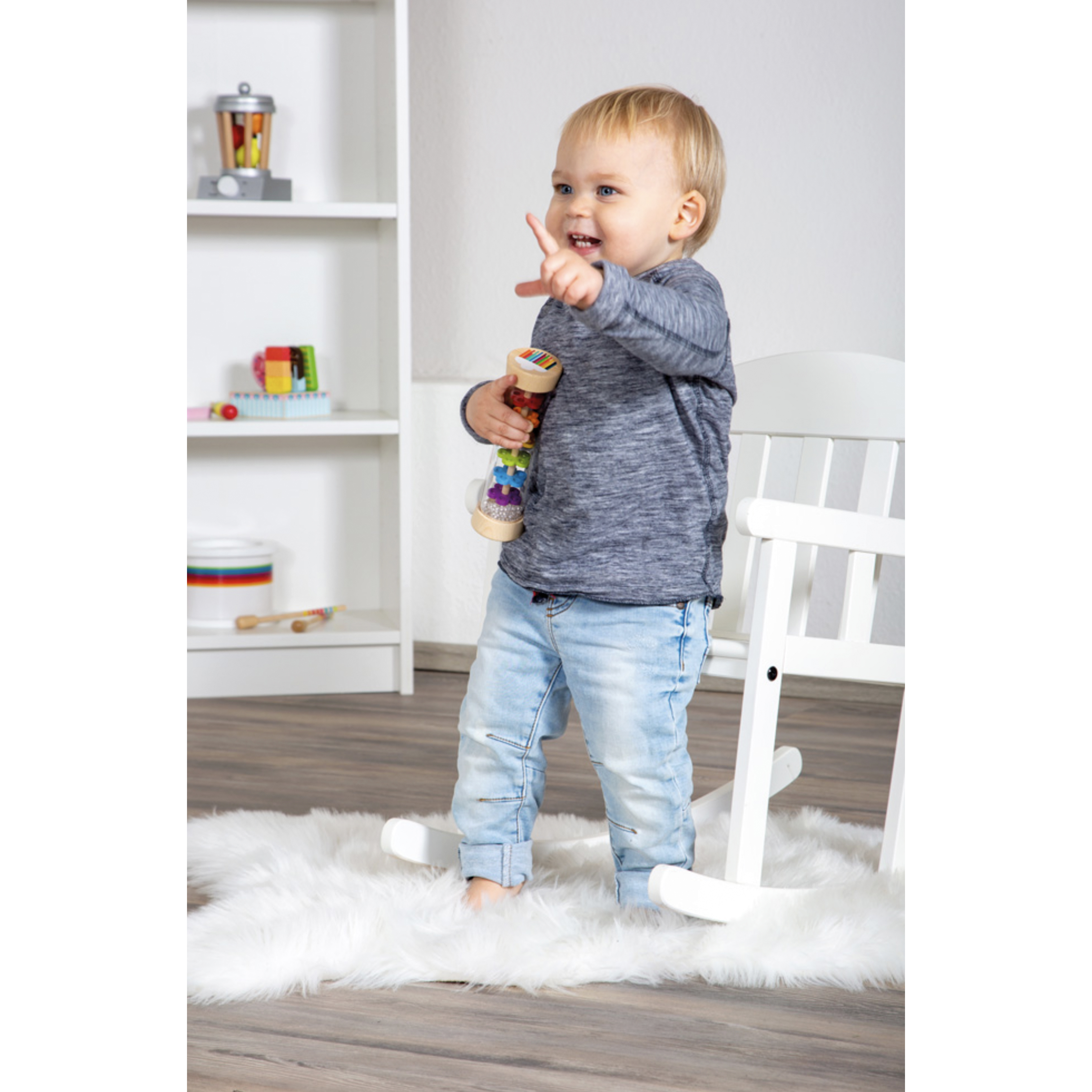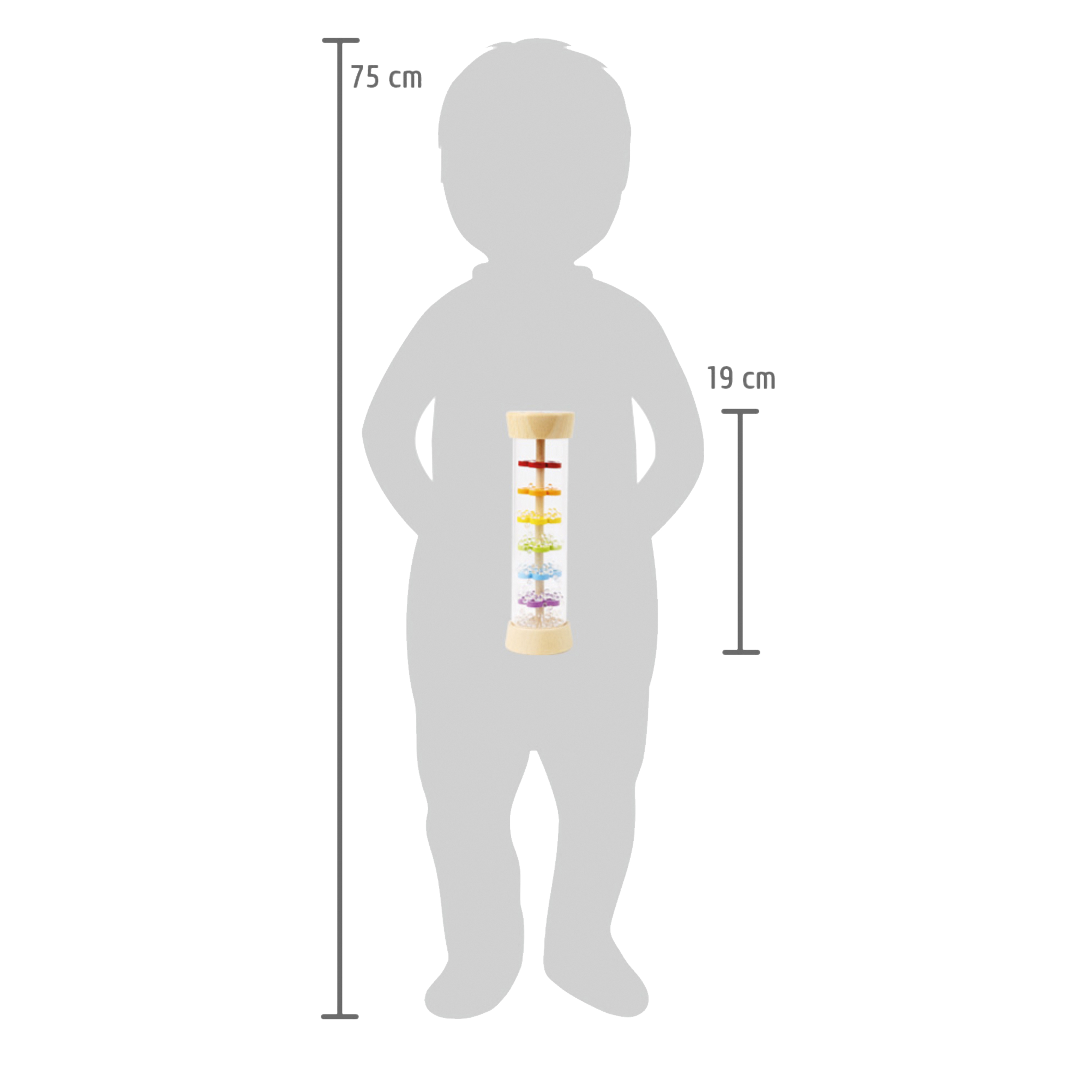 So klingt der Regen! Mit diesem Regenmacher lassen sich sanfte Regentöne imitieren. Vielseitig einsetzbar als Rassel, Rhythmusinstrument, Klangspielzeug oder beruhigendes Sinnesspiel zieht er nicht nur Kinder in seinen Bann. Der transparente Kunststoffkolben des Regenstabs gewährt freien Blick auf Kügelchen in Glasoptik, die durch die sechs farbigen Lochplatten in Blümchenform rieseln. So wird Akustik und visuelle Wahrnehmung geschult. Auch als Rassel und Spielzeug zum Rollen für Babys und Kleinkinder geeignet.