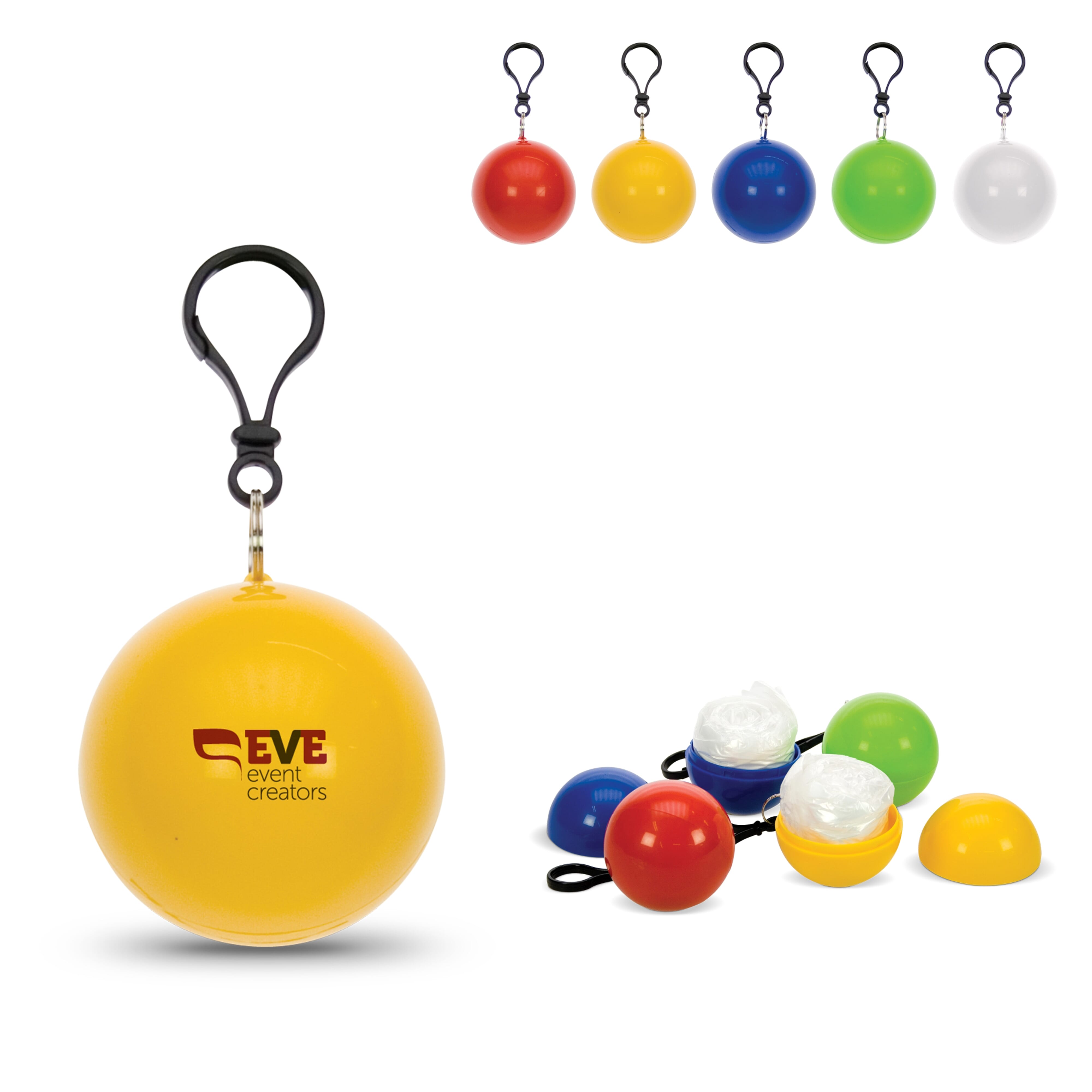 Ein Regenponcho verpackt in einer Kunststoffkugel. Sehr praktisch, wenn man unterwegs vom Regen überrascht wird. Den Schlüsselanhänger können Sie leicht an einem Fahrrad oder einer Tasche befestigen.