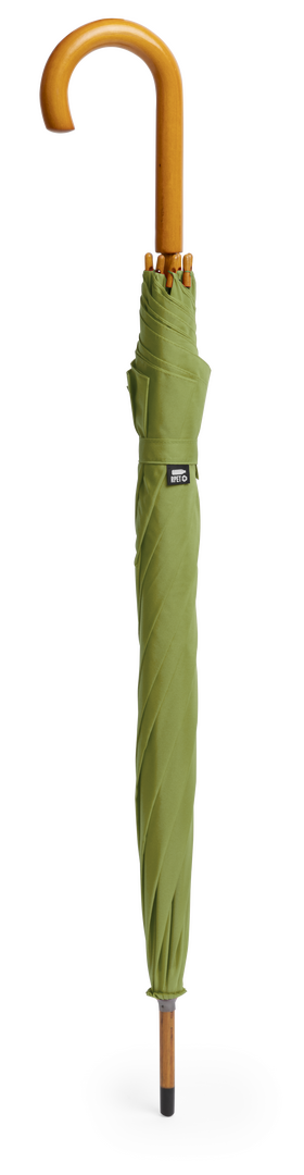 Schirm mit einem Durchmesser von 105 cm aus Naturfaser. Aus 190T RPET Pongee Material, aus recyceltem Kunststoff hergestellt, zur Wiederverwendung von Kunststoffabfall zu fördern und die Nachhaltigkeit des Planeten zu helfen. Automatische Öffnung und Metallstangen. Griff und Schaft aus Holz, mit unverwechselbarem RPET-Label.
