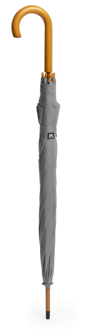 Schirm mit einem Durchmesser von 105 cm aus Naturfaser. Aus 190T RPET Pongee Material, aus recyceltem Kunststoff hergestellt, zur Wiederverwendung von Kunststoffabfall zu fördern und die Nachhaltigkeit des Planeten zu helfen. Automatische Öffnung und Metallstangen. Griff und Schaft aus Holz, mit unverwechselbarem RPET-Label.