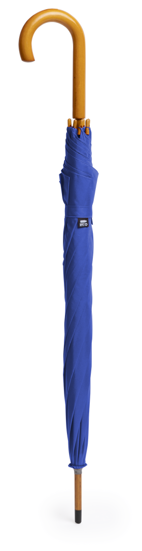 Schirm mit einem Durchmesser von 105 cm aus Naturfaser. Aus 190T RPET Pongee Material, aus recyceltem Kunststoff hergestellt, zur Wiederverwendung von Kunststoffabfall zu fördern und die Nachhaltigkeit des Planeten zu helfen. Automatische Öffnung und Metallstangen. Griff und Schaft aus Holz, mit unverwechselbarem RPET-Label.