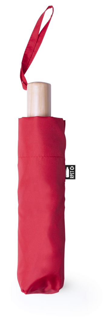 Faltschirm der Nature-Linie mit 95 cm Durchmesser. Aus 190T-Pongee-RPET-Material, das aus recycelten Kunststoffmaterialien gewonnen wird, um die Wiederverwendung von Kunststoffabfällen zu fördern und zur Nachhaltigkeit der Erde beizutragen. Manuelle Öffnung, mit winddichtem Mechanismus und Metallrippen. Holzgriff, mit Tragegurten und Tasche in passenden Farben. RPET-Markenetikett.
