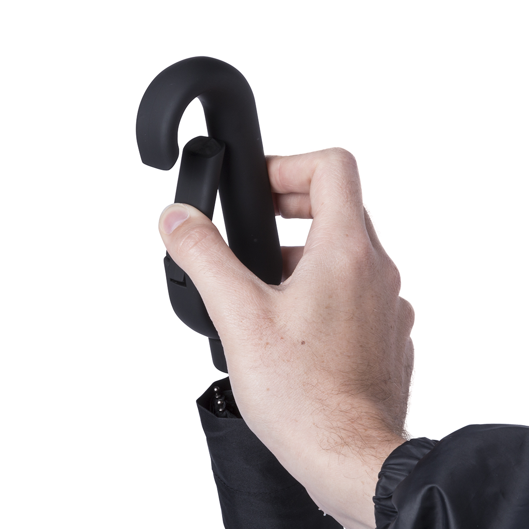 Winddichter Taschenschirm mit 8 Panelen aus robustem Pongee-Material in einer Vielzahl von Farben. Mit einem Durchmesser von 100 cm, manueller Öffnung und Fiberglasgestänge in Schwarz sowie Klettverschluss und ergonomischem Griff mit integriertem Karabiner. Präsentiert in einer individuellen Hülle in passender Farbe.