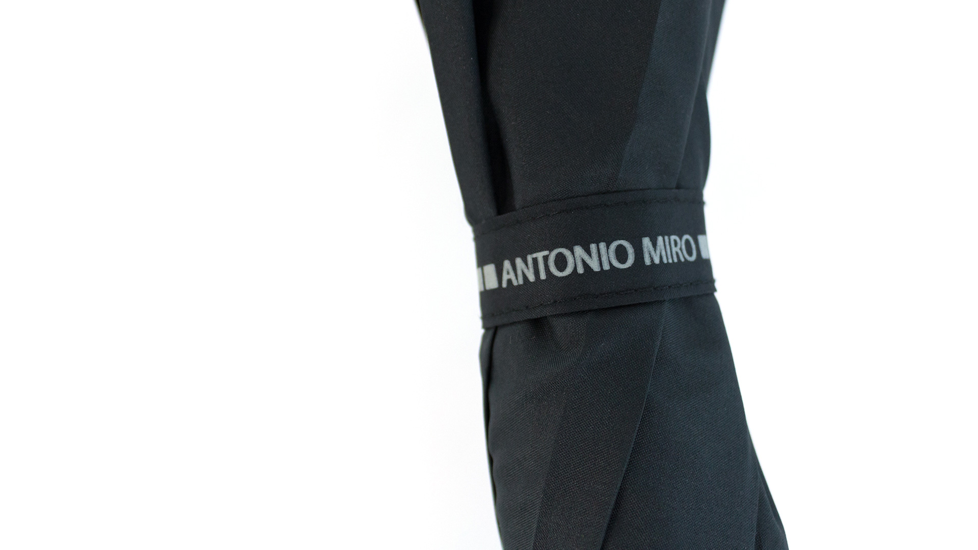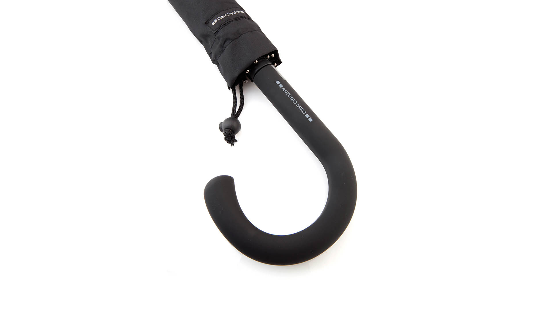 Winddichter Regenschirm von Antonio Miró mit 8 Panelen aus robustem Pongee-Material in elegantem Schwarz. Mit einem Durchmesser von 120 cm, automatischer Öffnung und Metallstangen in Schwarz sowie Klettverschluss und Soft-Touch-Griff. Präsentiert in einer Hülle mit dem Markenlogo und Kordelzug mit Stopper.