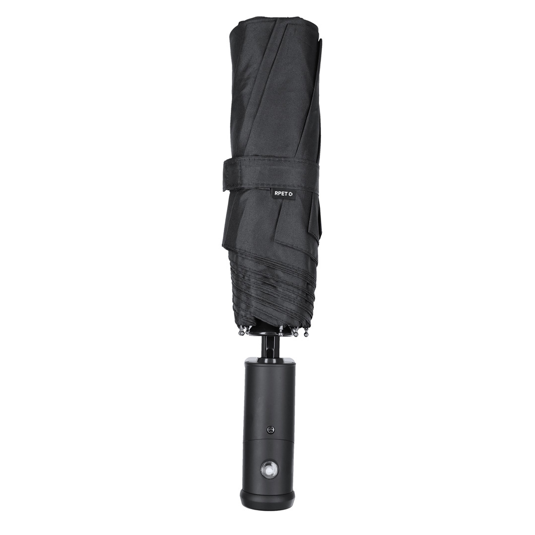Regenschirm aus RPET. Mit praktischem 180º drehbarem Laternengriff aus Soft-Touch-Gummi und Ein / Aus-Taste. Durchmesser von 105 cm, aus 190T RPET Pongee-Material. Automatisches Öffnen und Schließen, mit winddichtem Mechanismus und Fiberglasrippen. Etikett mit RPET-Logo. Batteriebetrieben (Knopfzellen enthalten).RPET-Material besteht aus recyceltem Kunststoff, fördert somit die Wiederverwendung von Plastikabfällen und trägt zur Nachhaltigkeit des Planeten bei.