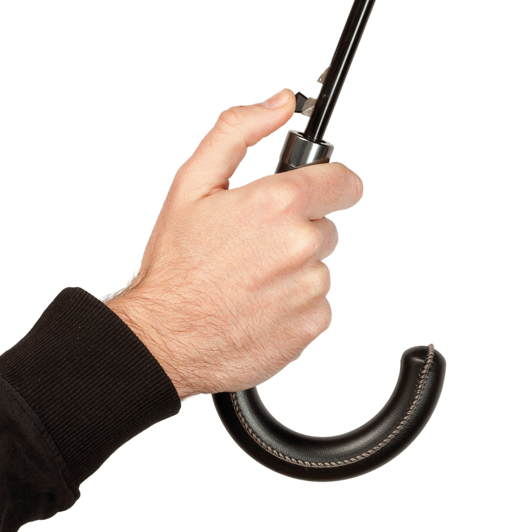 Regenschirm von Antonio Miró mit 8 Panelen aus resistentem Pongee-Material in elegantem Schwarz mit weißer Paspelierung. Mit einem Durchmesser von 100 cm, automatischer Öffnung und Metallstangen in Schwarz sowie Klettverschluss und Soft-Touch-Griff aus Kunstleder. Enthält einen Verschlussriemen mit verstellbarem Verschluss und dem Markenlogo.