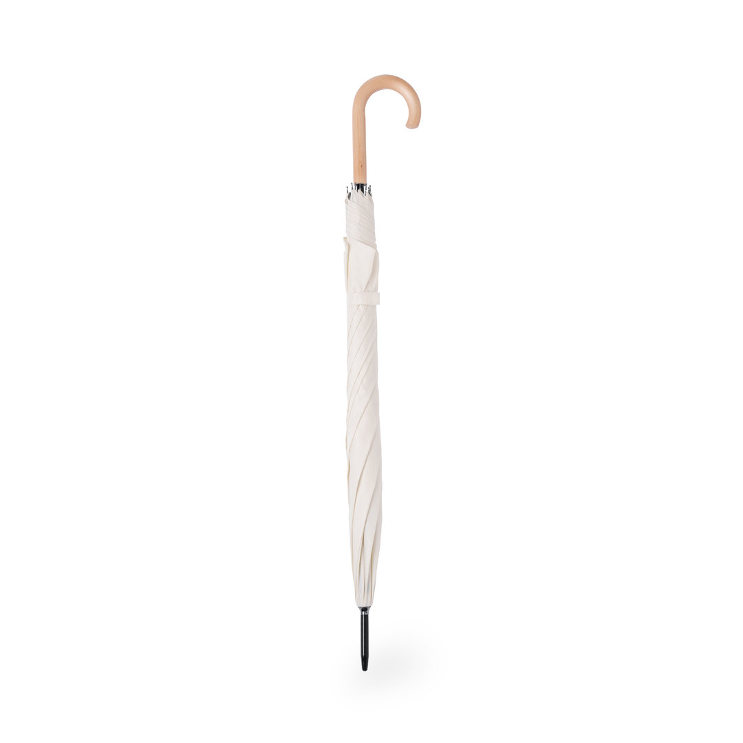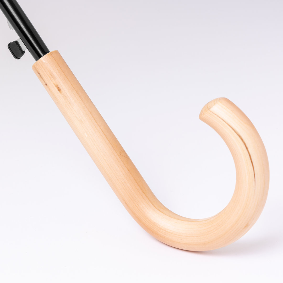 8-Panel-Regenschirm mit 120 cm Durchmesser, hergestellt aus widerstandsfähigem 190T-Pongee-Material mit natürlichem Finish. Automatischer Öffnungs- und Windschutzmechanismus. Mit schwarzen Faserrippen, Holzgriff und Riemen mit Klettverschluss.