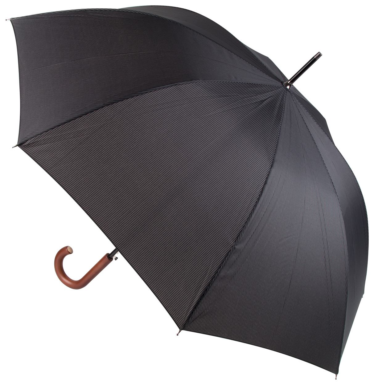 Automatischer Windproof-Stockschirm mit 8 Segmenten, Bespannung in Nadelstreifen (schwarz / grau), Holzgriff, Metallrahmen und Fiberglasspeichen. Material: 190T Pongee. Marke: André Philippe.