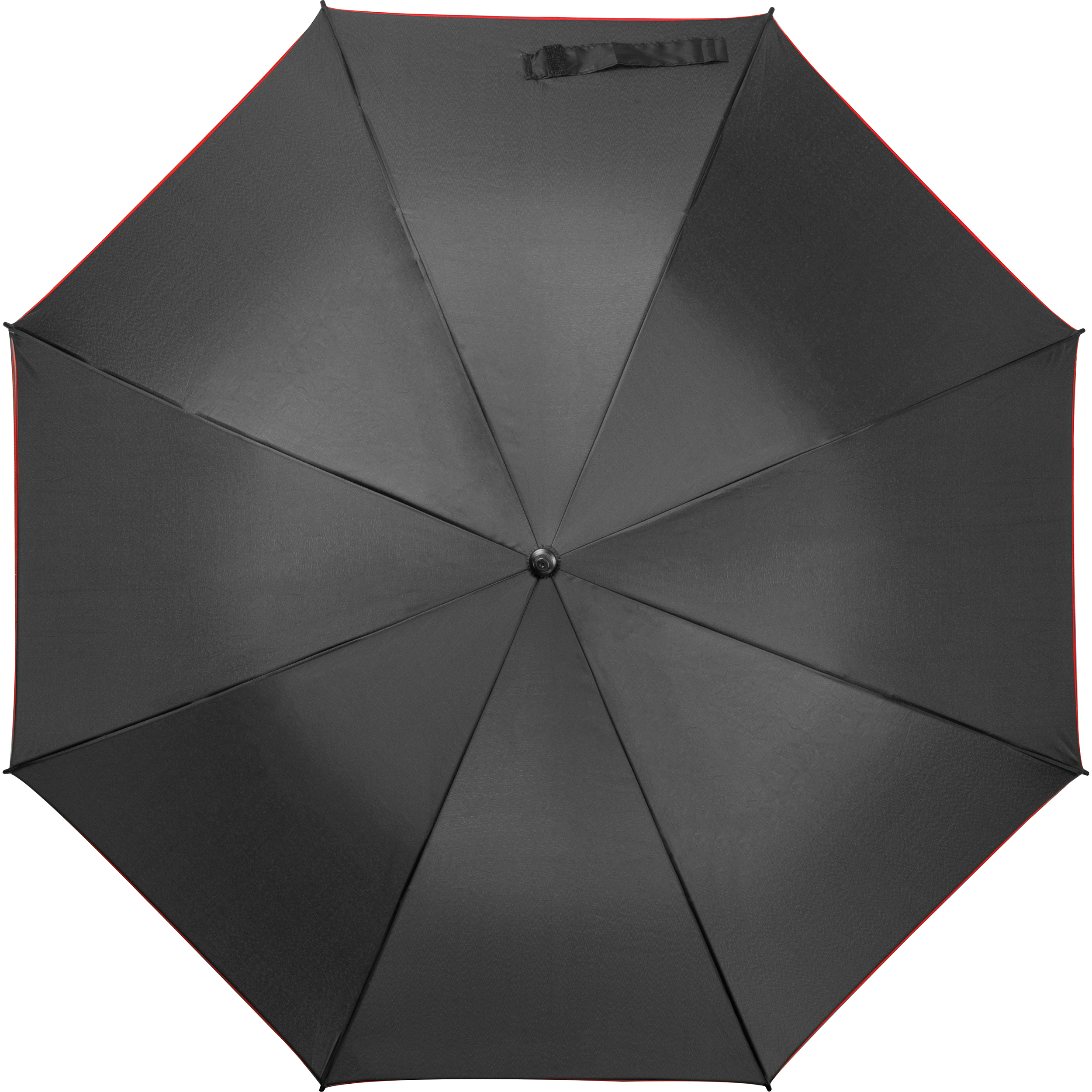 Schwarzer Stockschirm aus 190T Pongee mit farbigem Rand, automatischer Öffnung und Fiberglas Gestänge. Ihre Werbung drucken wir auf ein Segment.