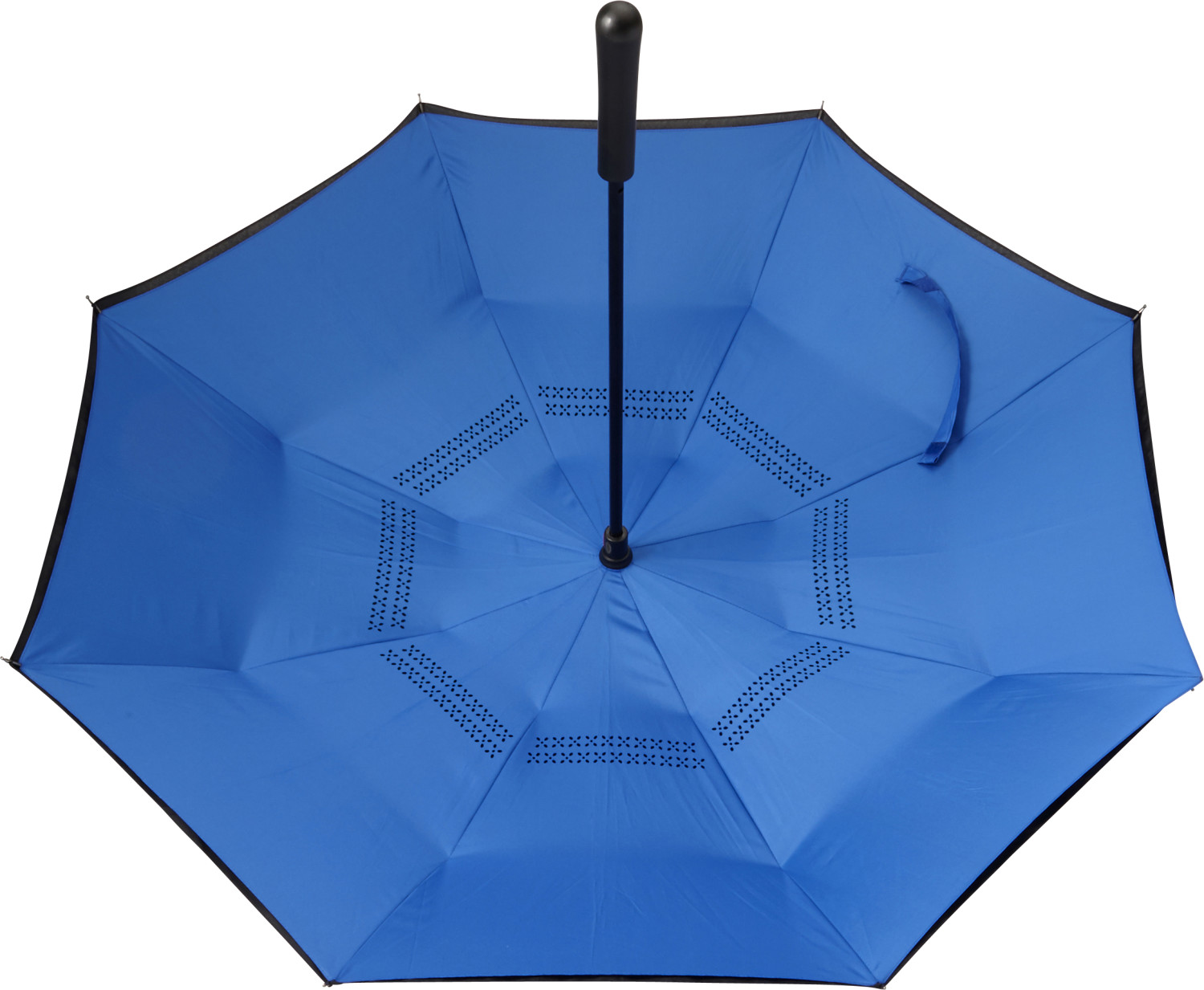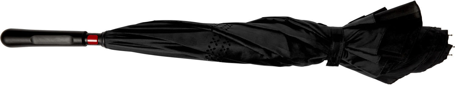 Regenschirm, reversibel, doppelt beschichtet aus Pongee-Seide, mit schwarzem Fiberglasgestell und -stangen, Aluminiumschaft, Kunststoffgriff und Klettverschluss.