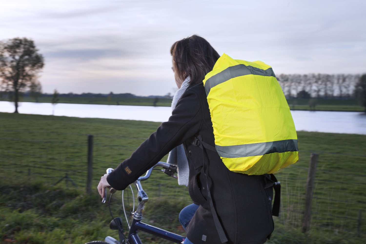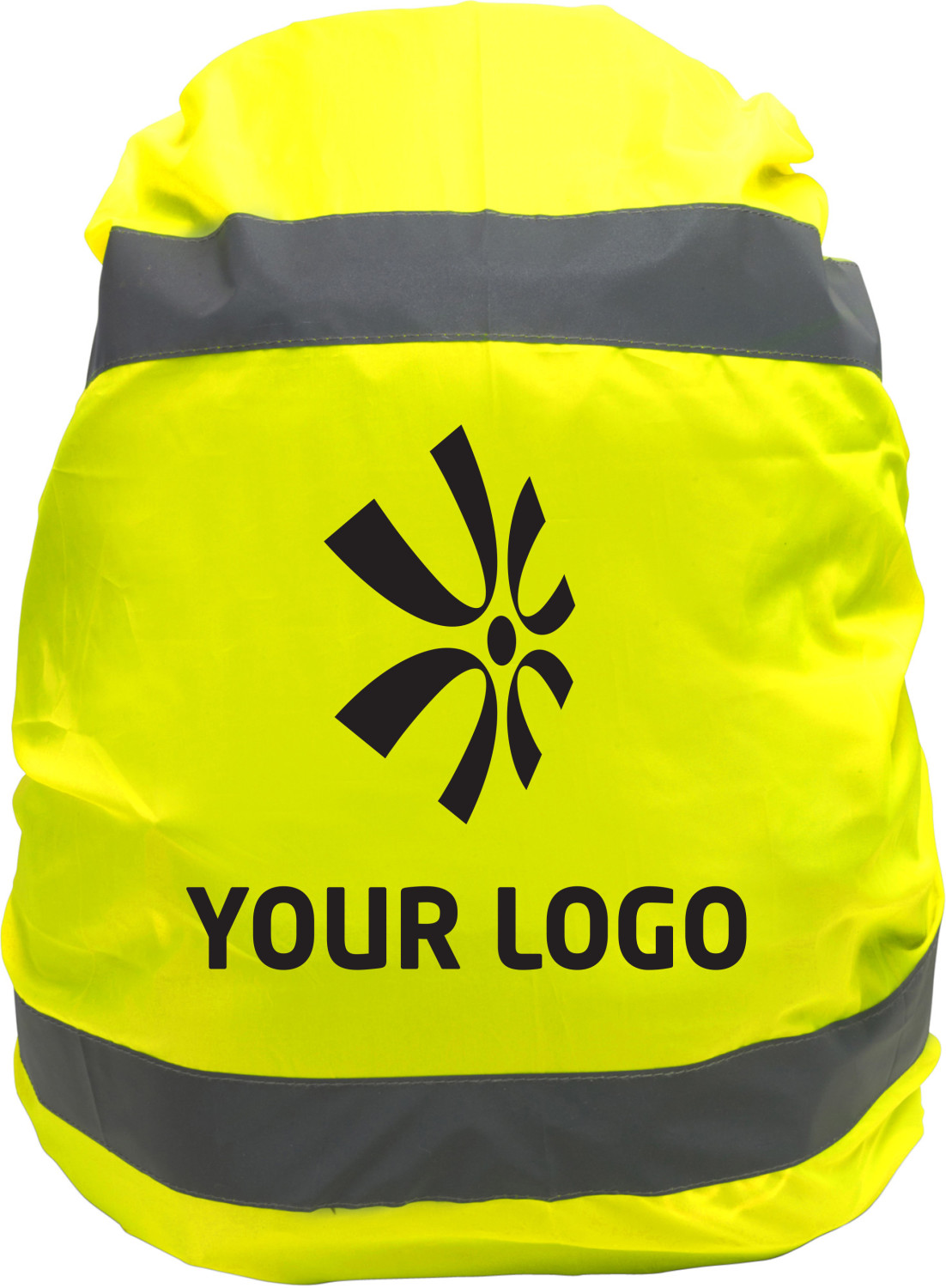 Regenschutz für Rucksäcke mit Reflektorstreifen und Zugband.