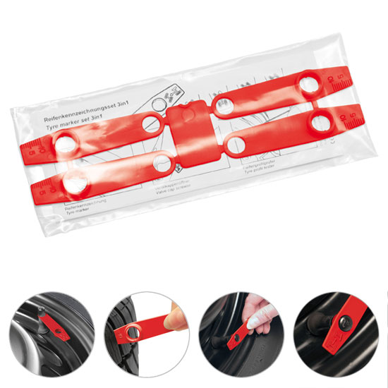 Reifenkennzeichnungsset mit Reifenprofiltiefenmessern und Ventilkappendrehern, inkl. Gebrauchsanweisung (D / GB / F/E) und Einzelverpackung in Polybeutel