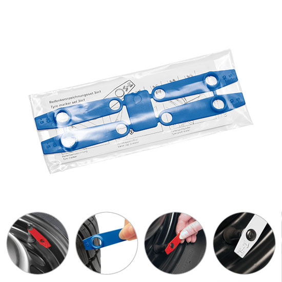 Reifenkennzeichnungsset mit Reifenprofiltiefenmessern und Ventilkappendrehern, inkl. Gebrauchsanweisung (D / GB / F/E) und Einzelverpackung in Polybeutel
