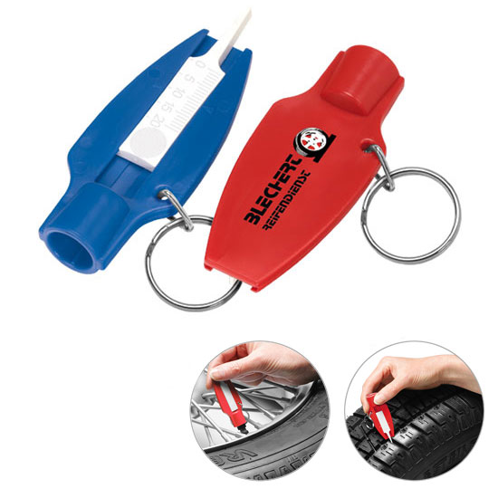 Reifenprofiltiefenmesser mit Ventilkappendreher mit Schlüsselring. Farbkombinationen möglich. Druckkosten pro Position