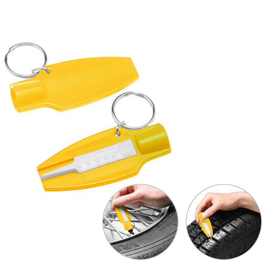 Reifenprofiltiefenmesser mit Ventilkappendreher mit Schlüsselring. Farbkombinationen möglich. Druckkosten pro Position