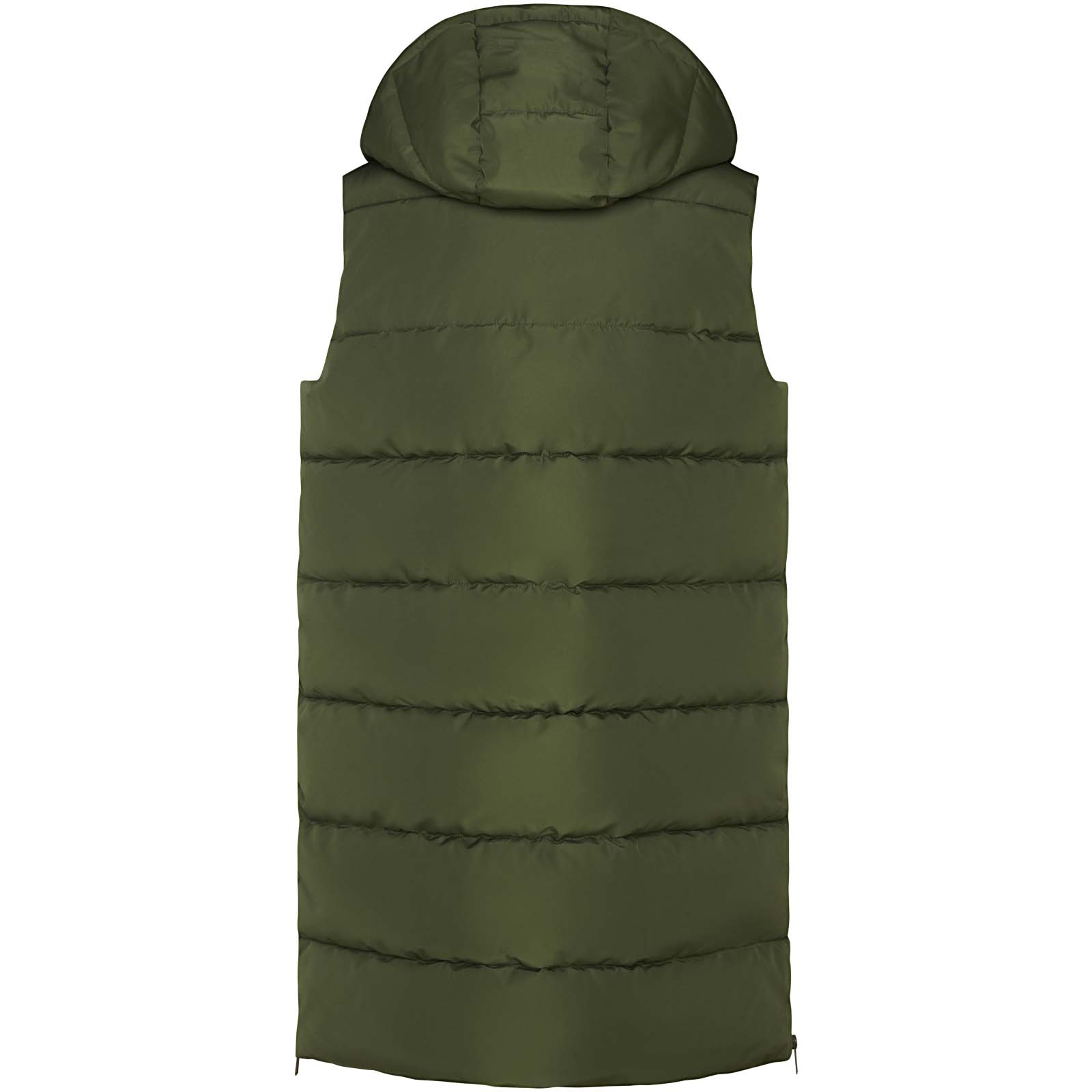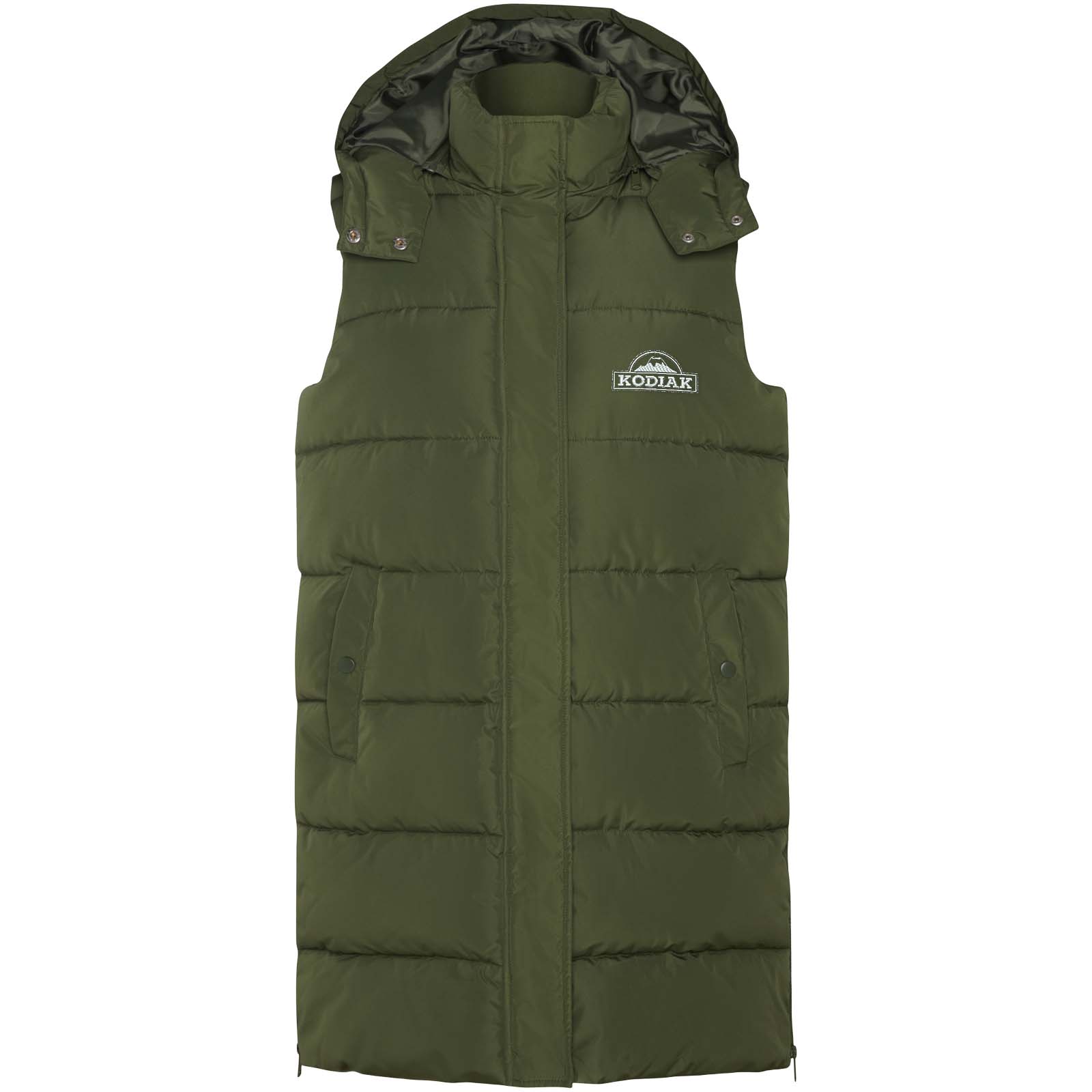 Wattierte Weste mit abnehmbarer Kapuze. Hoher Kragen. Reißverschluss auf der Vorderseite, verdeckt durch eine Patte. Zwei Taschen mit Druckknopfverschluss. Seitliche Öffnungen mit Reißverschlüssen. Zugang zur Brust von der Innenseite. Wasserabweisend.