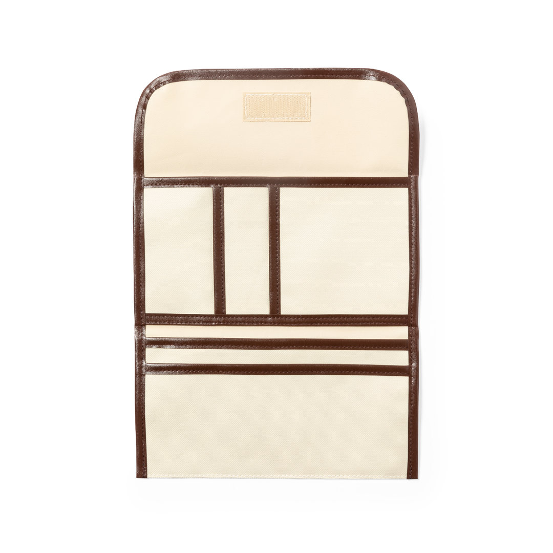 Reisetasche aus strapazierfähigem, naturfarbenem 600D mit braunem Kunstlederbesatz und Verstärkungen. Klappe mit Klettverschluss und einer Vielzahl von Innenfächern.