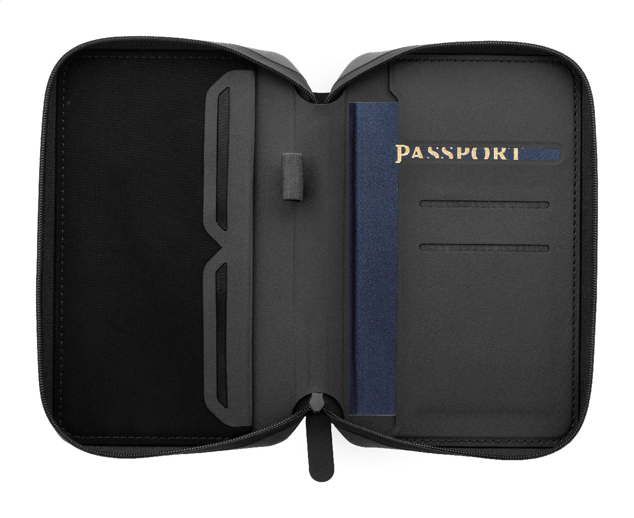 Luxuriöser Reiseorganizer und Passhülle aus recyceltem PU-Leder mit Reißverschluss. Mit mehreren Innentaschen für Dokumente, Karten und Reiseutensilien.