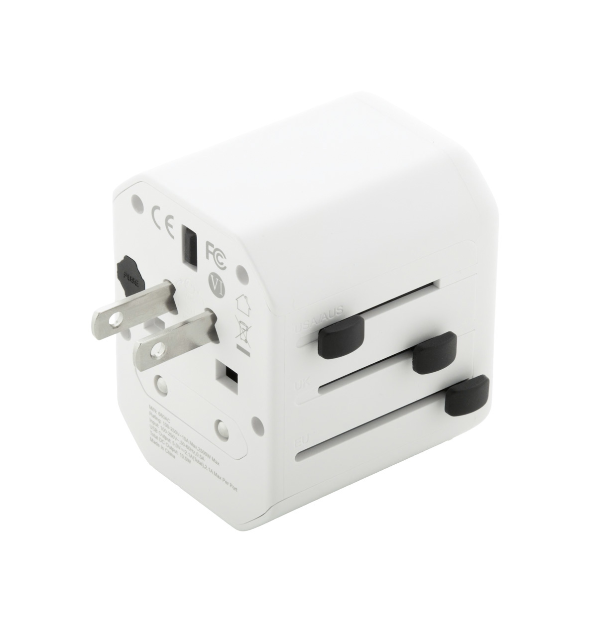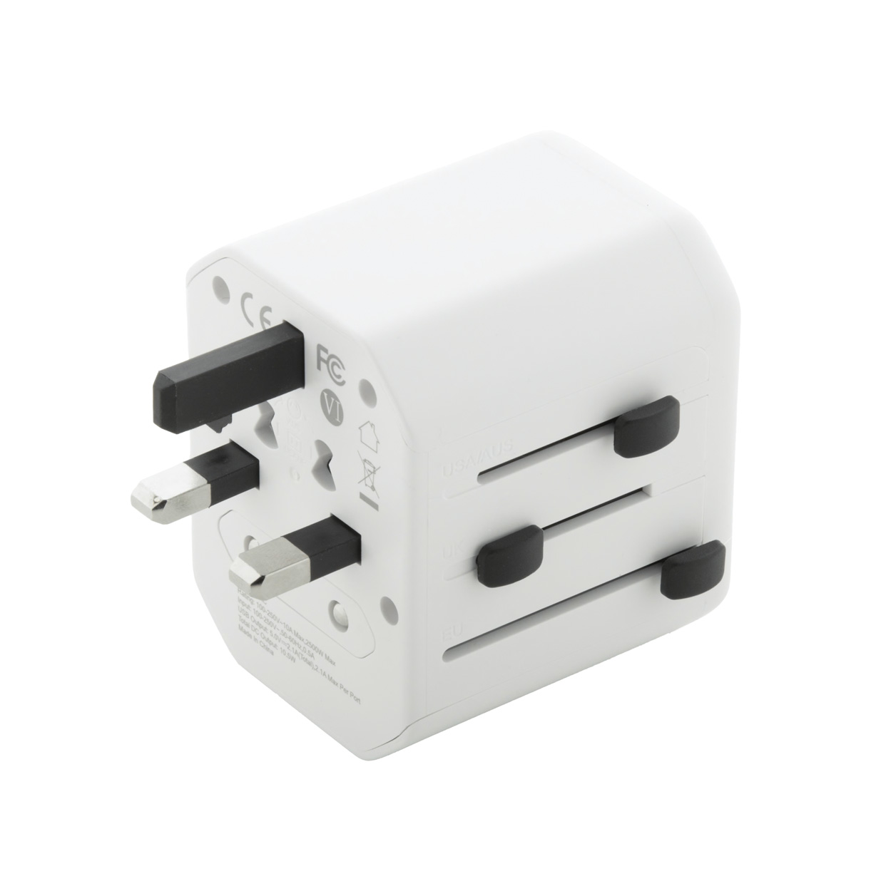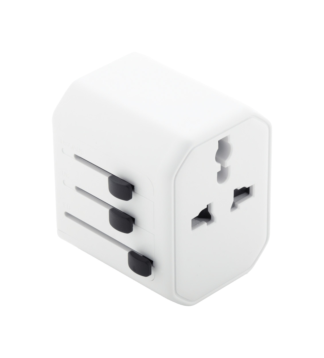 Universeller, weltweiter Reiseadapter aus ABS-Kunststoff mit integrierten Steckern für USA, Europa, Großbritannien und Australien. Mit 1 USB- und 1 USB-C-Ladeanschluss.