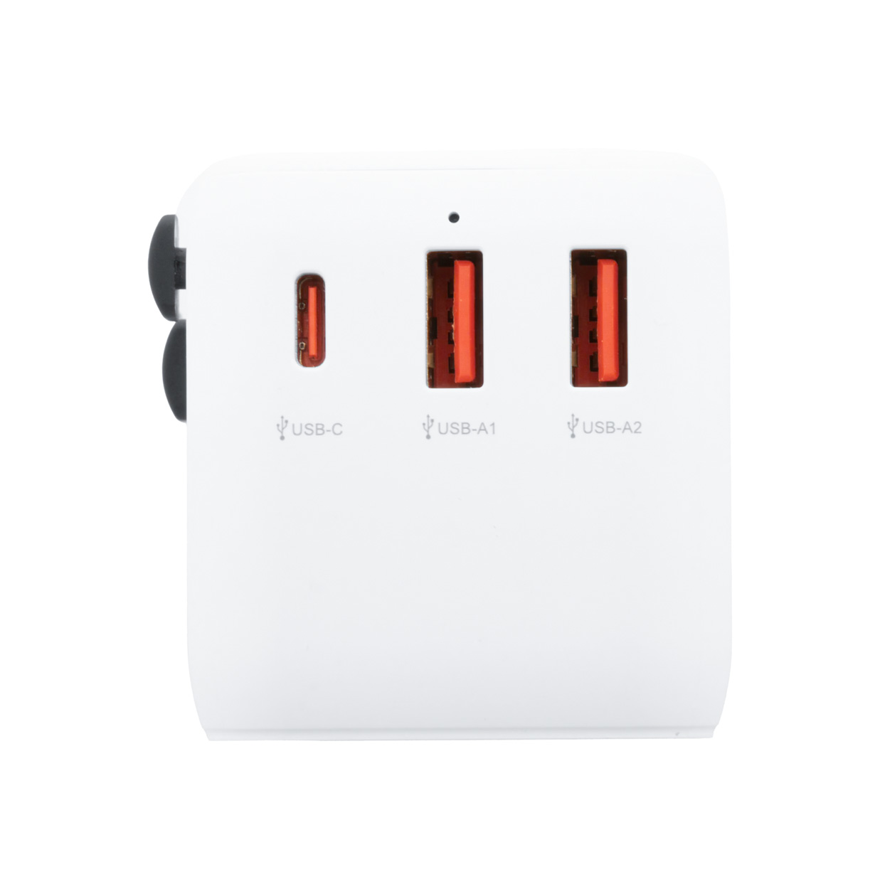 Universeller, weltweiter Reiseadapter aus ABS-Kunststoff mit integrierten Steckern für USA, Europa, Großbritannien und Australien. Mit 2 USB- und 1 USB-C-Schnellladeanschlüssen. Unterstützt die Schnellladetechnologie (PD20W)