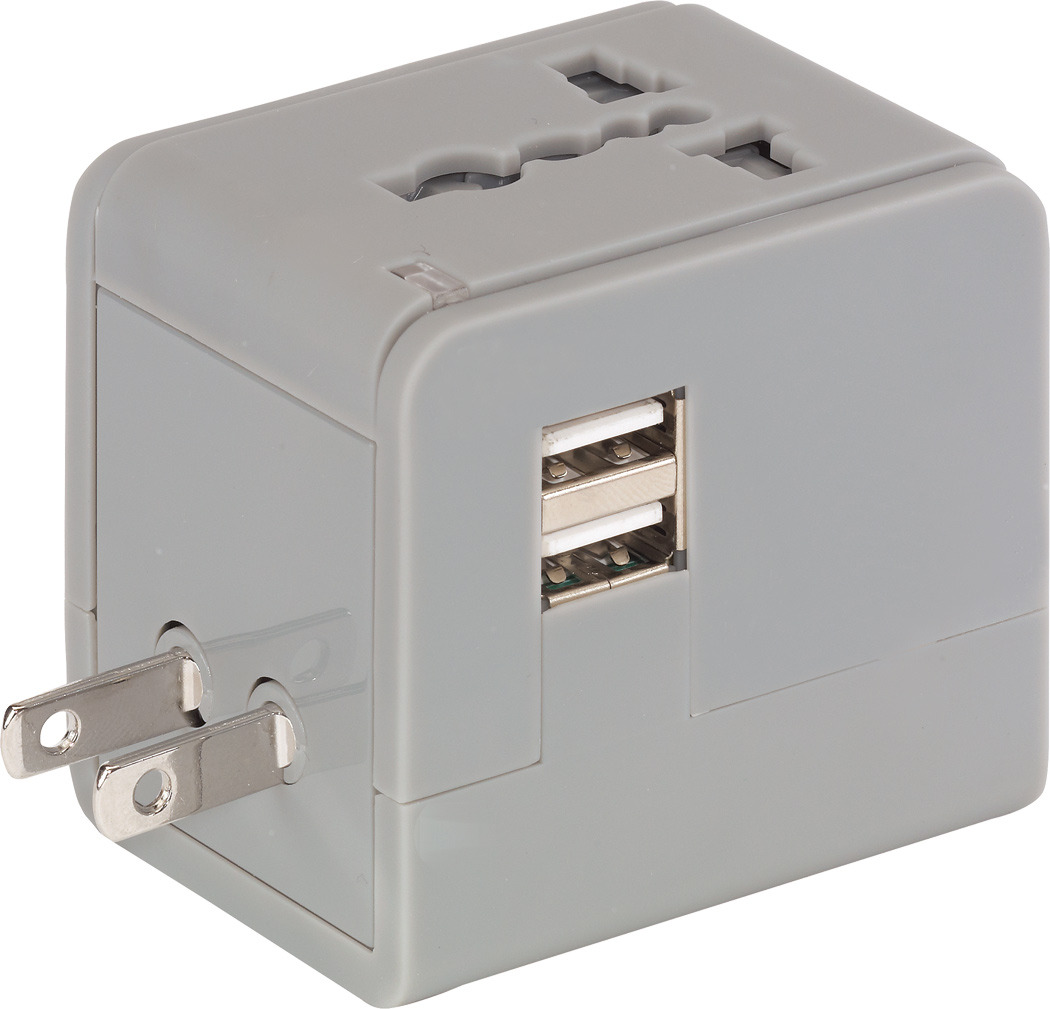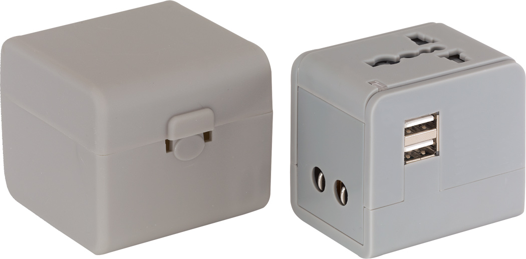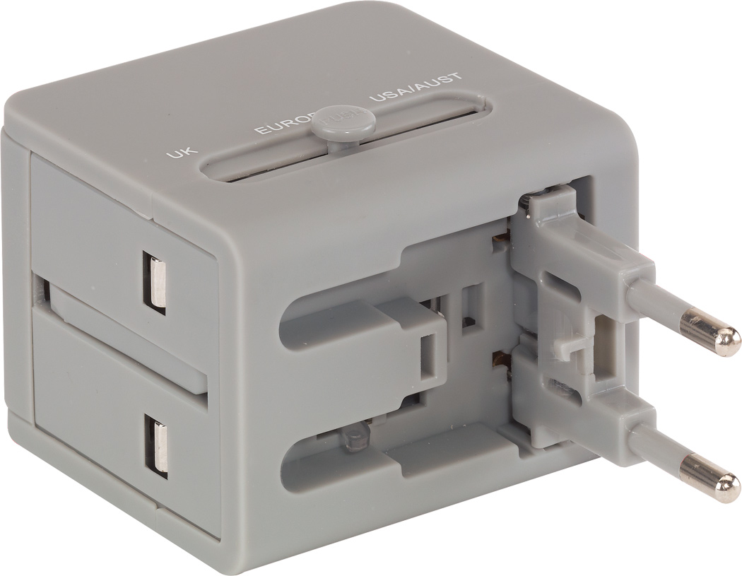 Reiseadapter TRAVEL MATE: mit Umschaltregler für UK, Europa, USA, Australien und Asien (nicht geeignet für die Schweiz), ausklappbare Stecker, mit 2 USB-Ladeanschlüssen bis 2,1 A für z. B. Smartphone, Tablets etc., Gehäuse mit gummierter Oberfläche, in farbig abgestimmter Aufbewahrungsbox,, nur für nicht geerdete Geräte zu verwenden, in Box