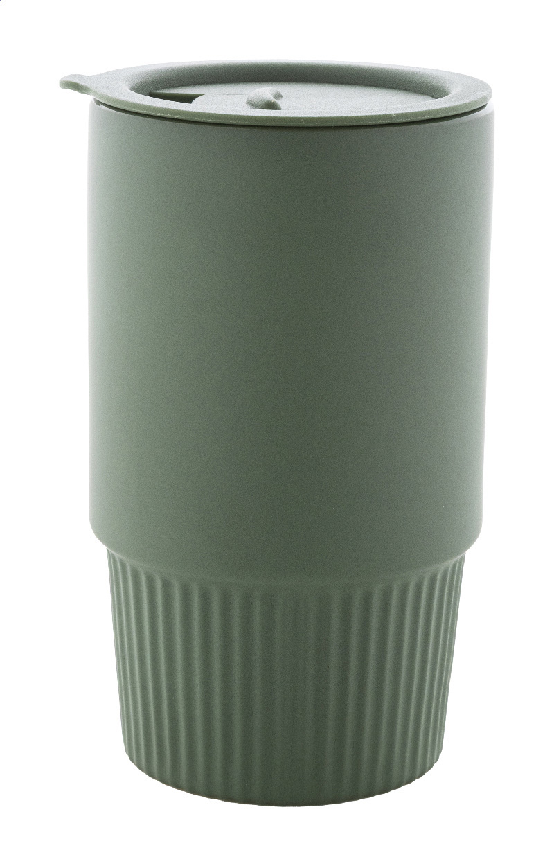 Hochwertiger Reisebecher aus Keramik mit matter Außenoberfläche und Trinkdeckel aus PP-Kunststoff. Füllmenge: 420 ml.