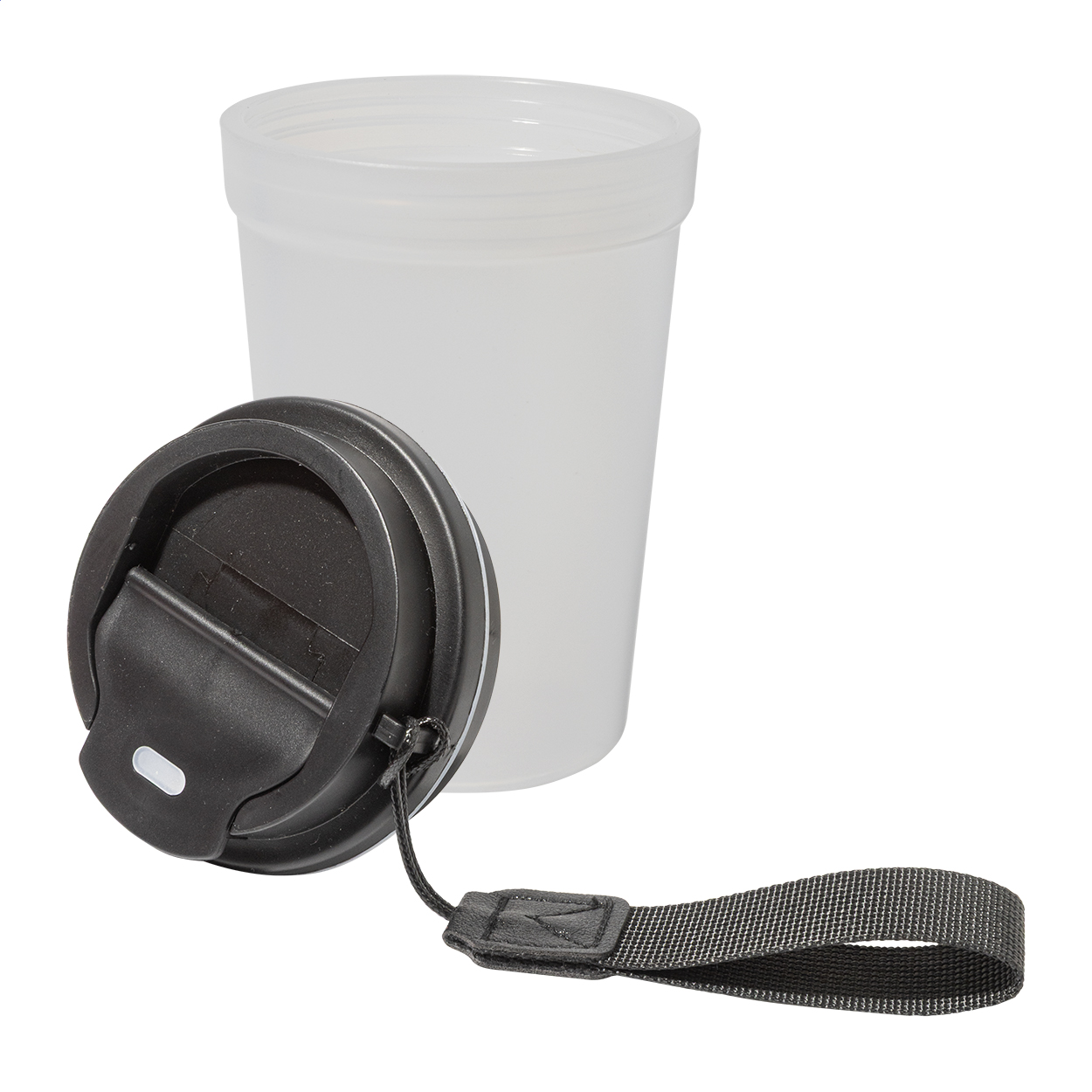 Einwandiger, gefrosteter Reisebecher aus PP-Kunststoff mit Trinkdeckel und Trageschlaufe aus RPET Polyester. Füllmenge: 400 ml.