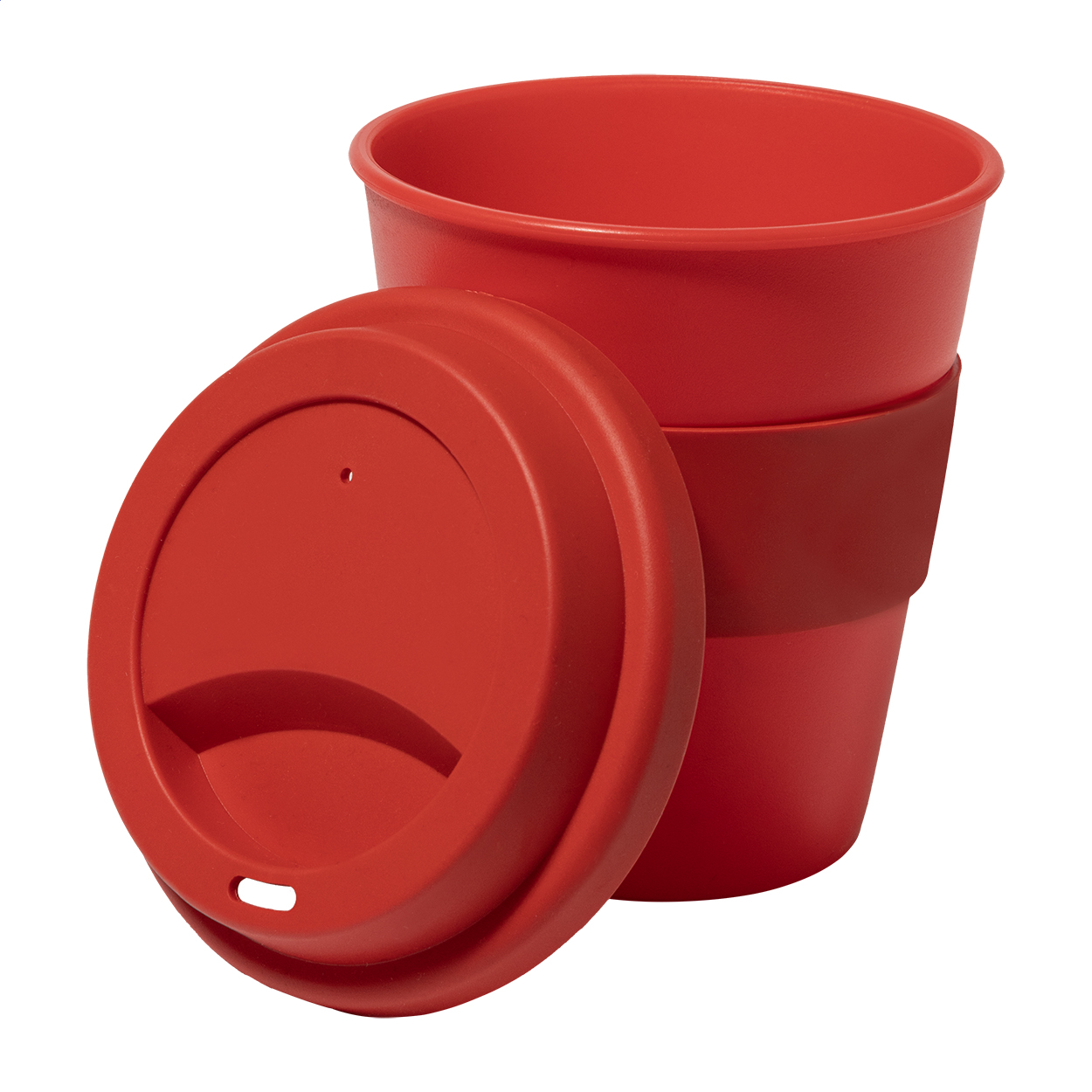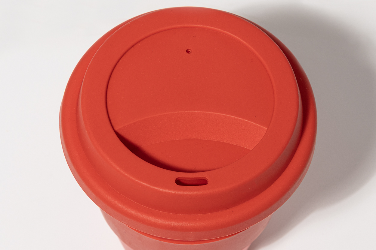 Einwandiger Reisebecher aus PP mit Trinkdeckel und Ring aus TPE. Füllmenge: 350 ml.