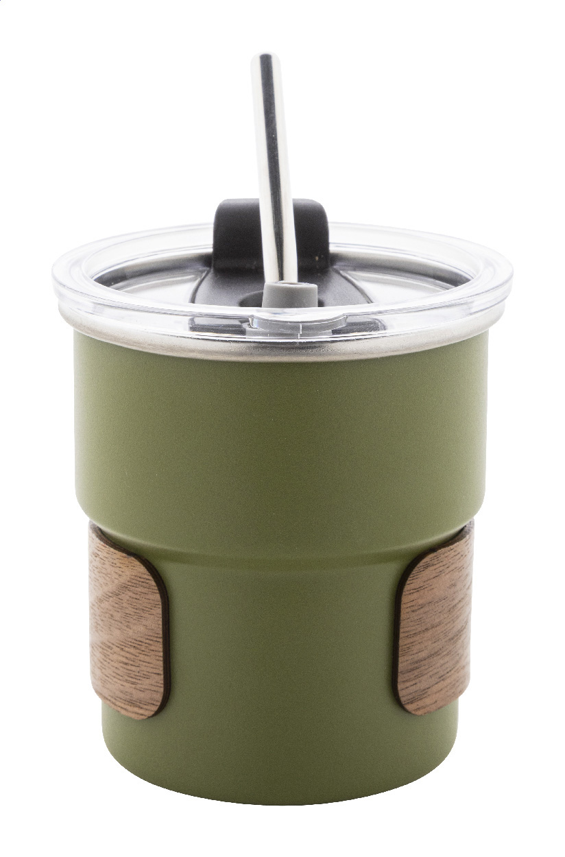 Einwandiger Reisebecher aus recyceltem Edelstahl mit Griff aus Walnussholz, Trinkdeckel aus Kunststoff und Strohhalm aus recyceltem Edelstahl. Füllmenge: 260 ml.