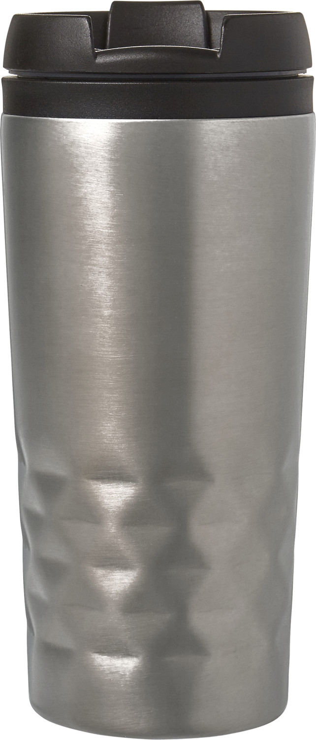 Thermobecher 'Brilliant' (300 ml) aus Edelstahl, doppelwandig, mit schwarzem Kunststoffdeckel (mit Klappverschluss) und Kunststoffinnenwand.
