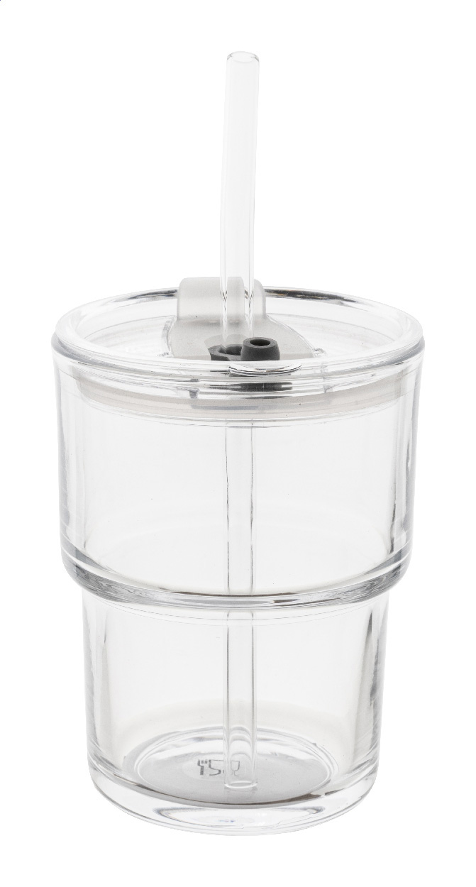 Reisebecher aus Glas mit Kunststoff-Trinkdeckel und Glasstrohhalm. Füllmenge: 400 ml.