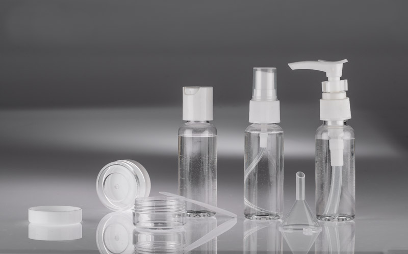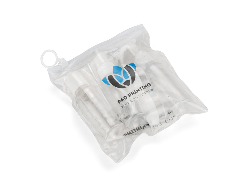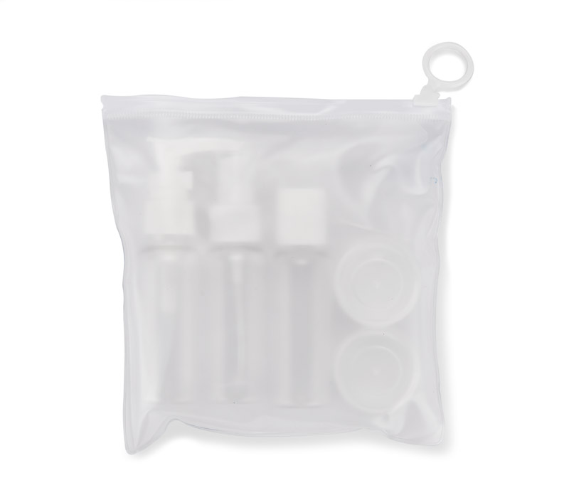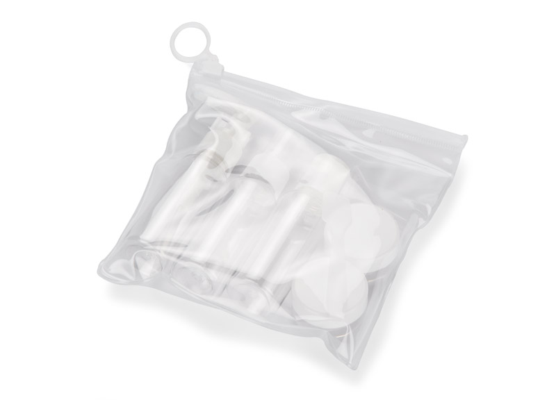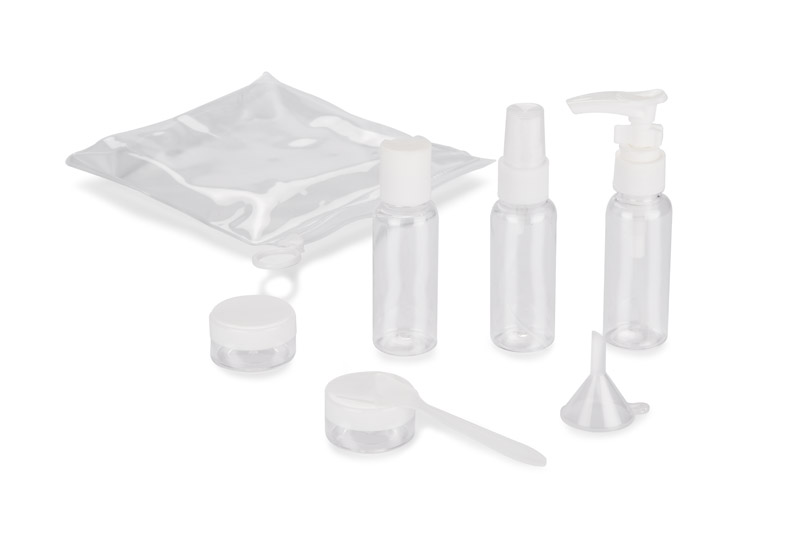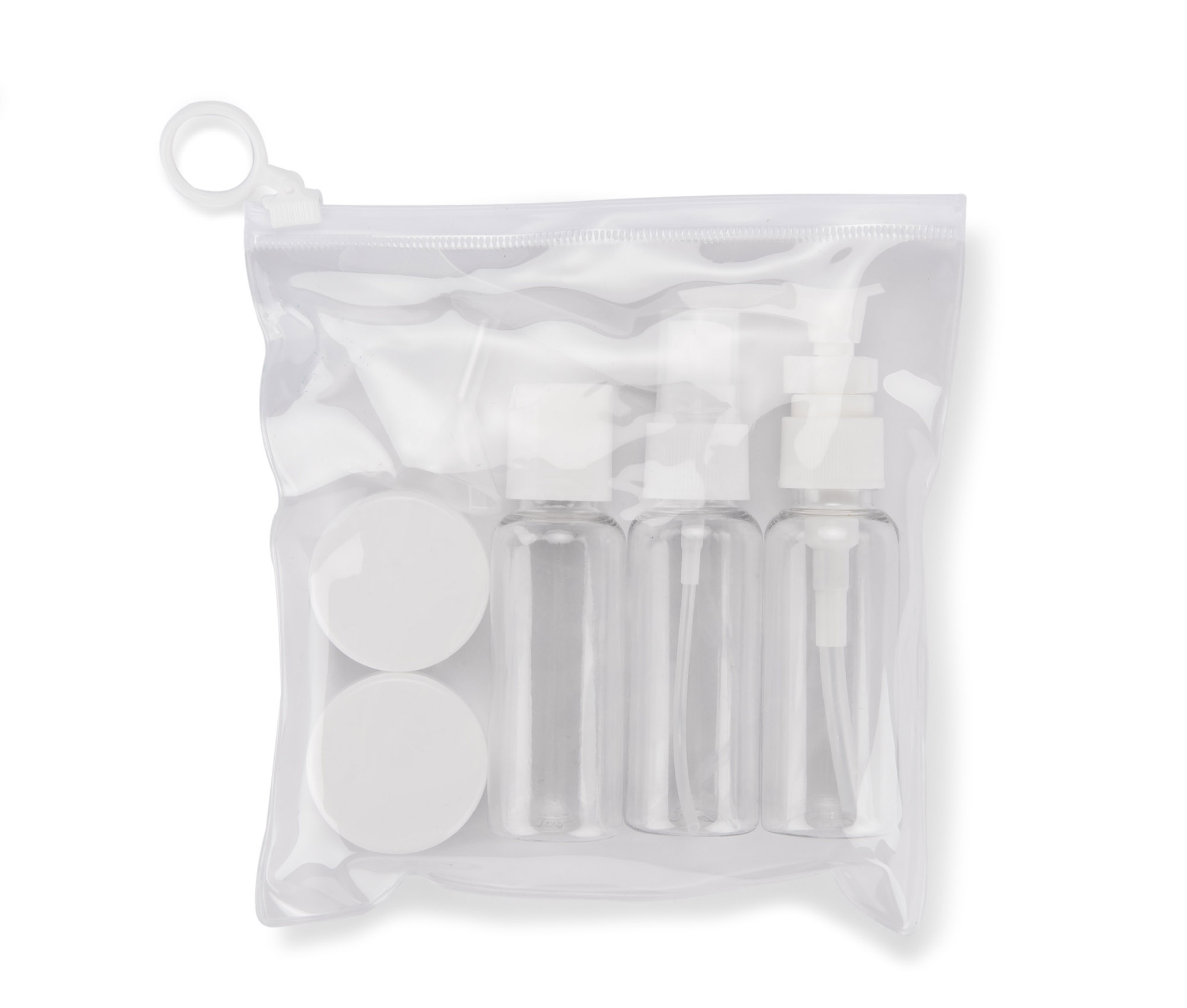 Das praktische AIRO Reisebehälter-Set ermöglicht eine bequeme und hygienische Aufbewahrung von Kosmetika auf Reisen. Es besteht aus: einer Flasche mit Zerstäuber, einer Flasche mit Pumpe, einer Flasche mit Verschluss und zwei Tiegeln. Der mitgelieferte Trichter erleichtert das präzise Ausgießen von Flüssigkeiten, und der Löffel ist ideal zum Auftragen von cremigen Kosmetika. Die transparenten Behälter mit weißem Deckel machen den Inhalt leicht erkennbar. Zum Set gehört auch ein Etui, das auf einer Seite transparent und auf der anderen milchig ist und mit einem Reißverschluss versehen ist. Die kompakte Größe der Behälter entspricht den Anforderungen von Fluggesellschaften.