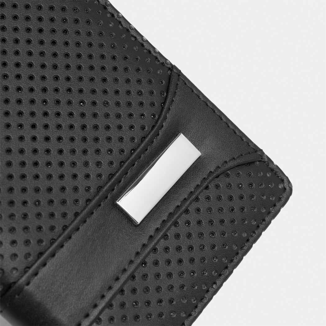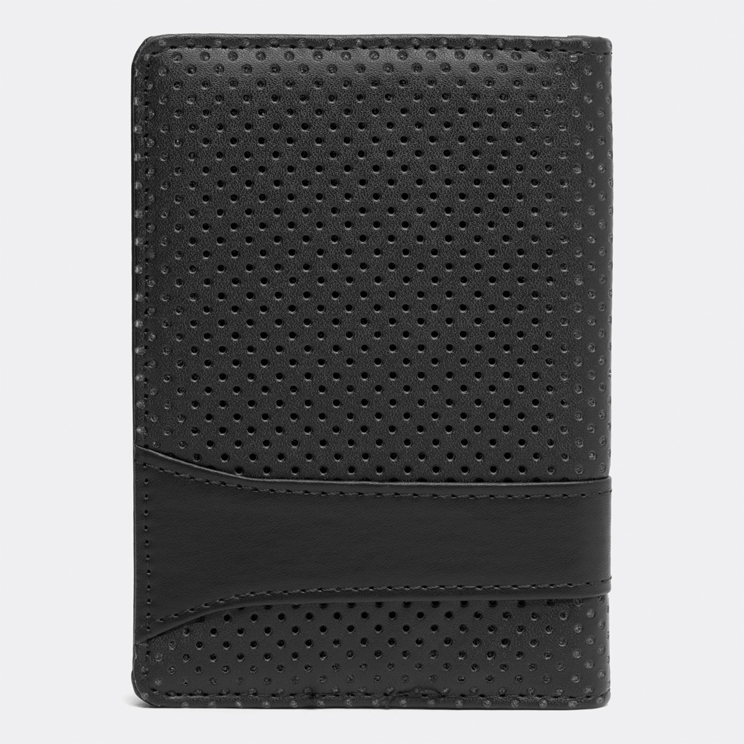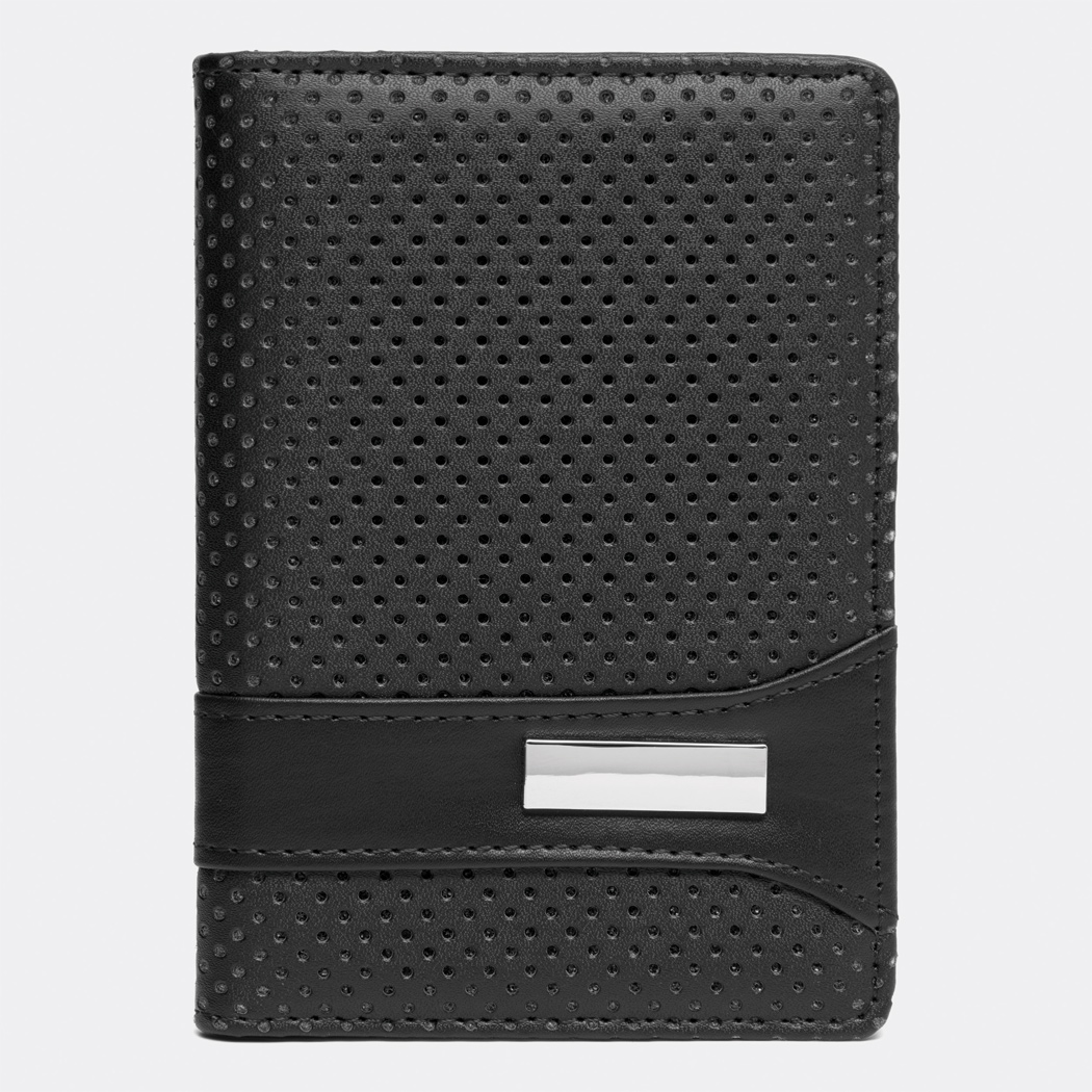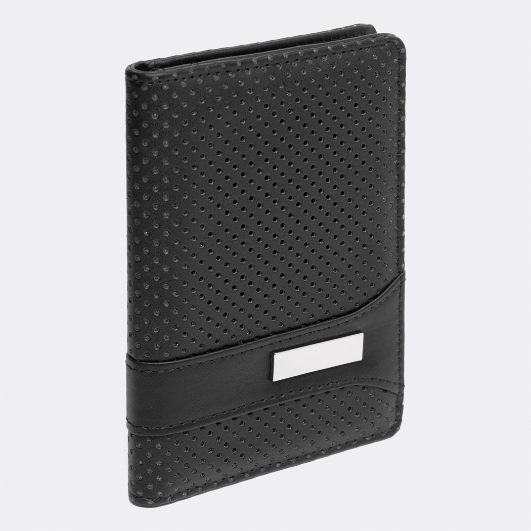 Reisepass-Börse HILL DALE: innen diverse Einsteckfächer für Geldkarten und 1 Netzfach für den Reisepass – außen in gestanzter Loch-Optik mit Metallplättchen für Ihre Werbeanbringung
