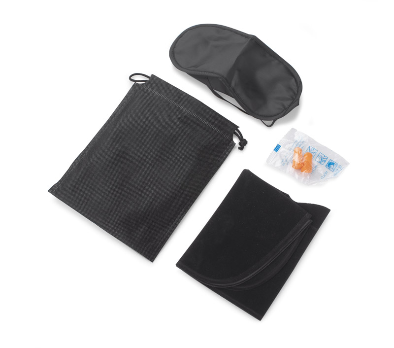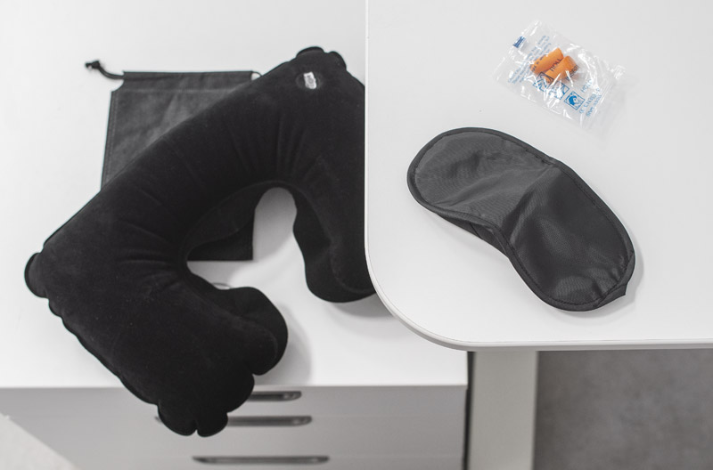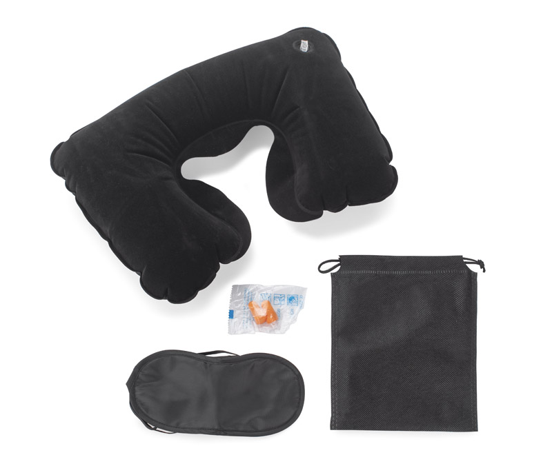 Das CINO-Reiseset besteht aus 3 Elementen: einer Augenbinde, 2 Ohrstöpseln und einem aufblasbaren Reisekissen, das mit einem weichen Material bezogen ist. Es nimmt wenig Platz ein, sodass dieses Produkt problemlos in Handgepäck gepackt werden kann. Es ist leicht und bequem. Es wird sicherlich mehr als eine Reise angenehmer machen. Das Set ist in einer schwarzen Tasche verpackt.