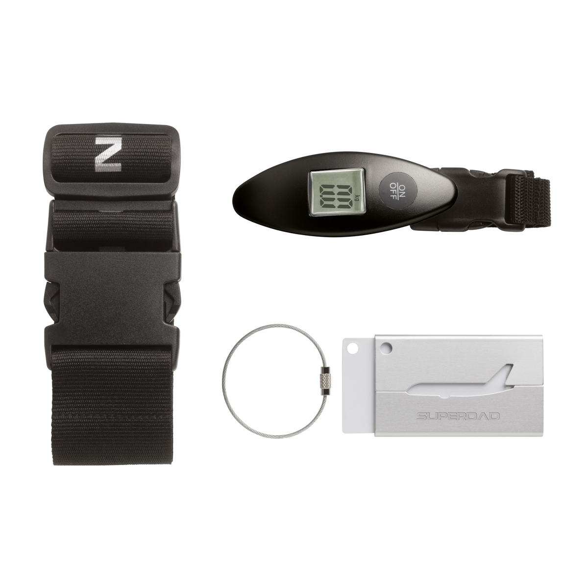 Hochwertiges Reisegeschenkset bestehend aus Kofferwaage, Koffergurt und Kofferanhänger. Die Kofferwaage wiegt bis zu 40 kg/88lbs.