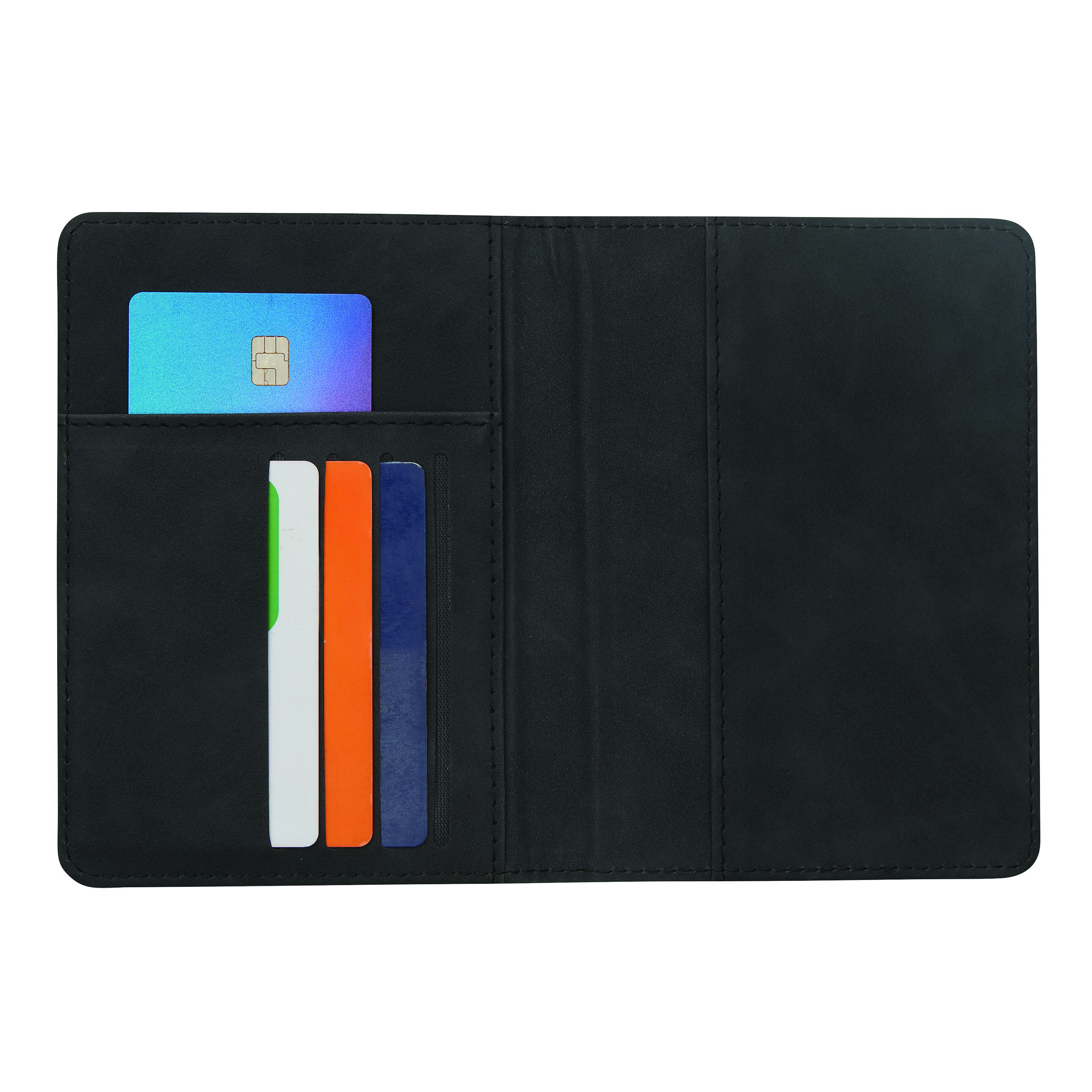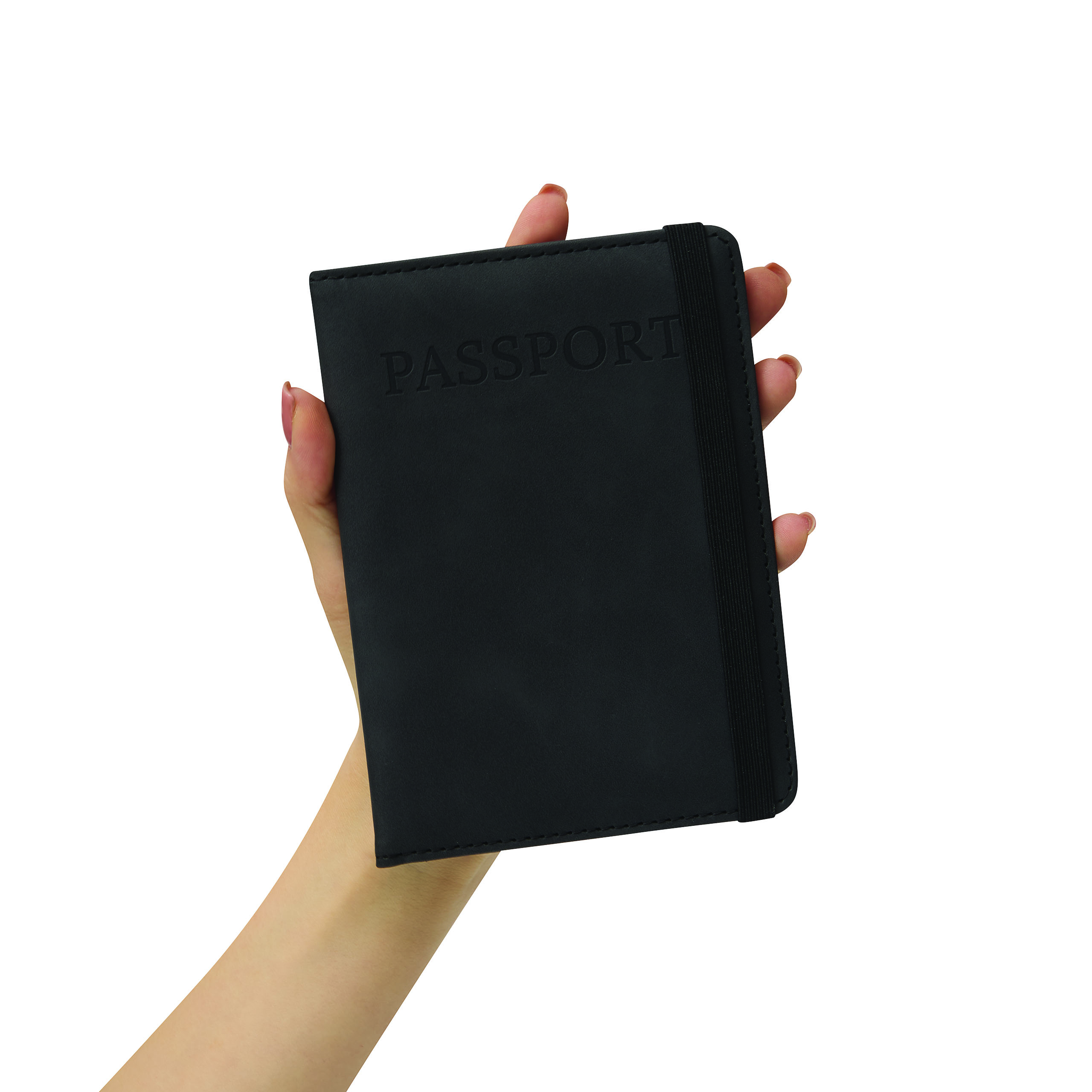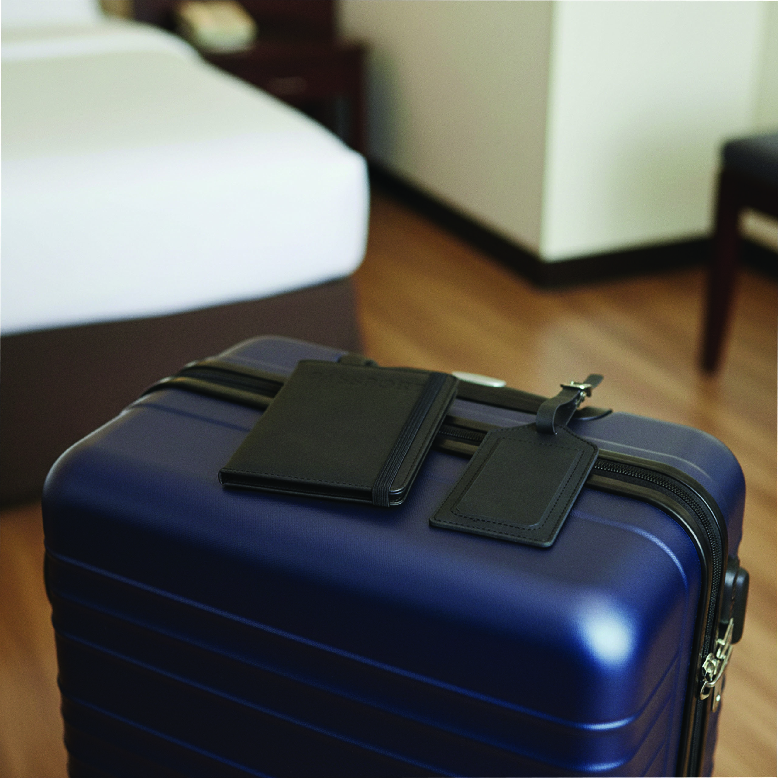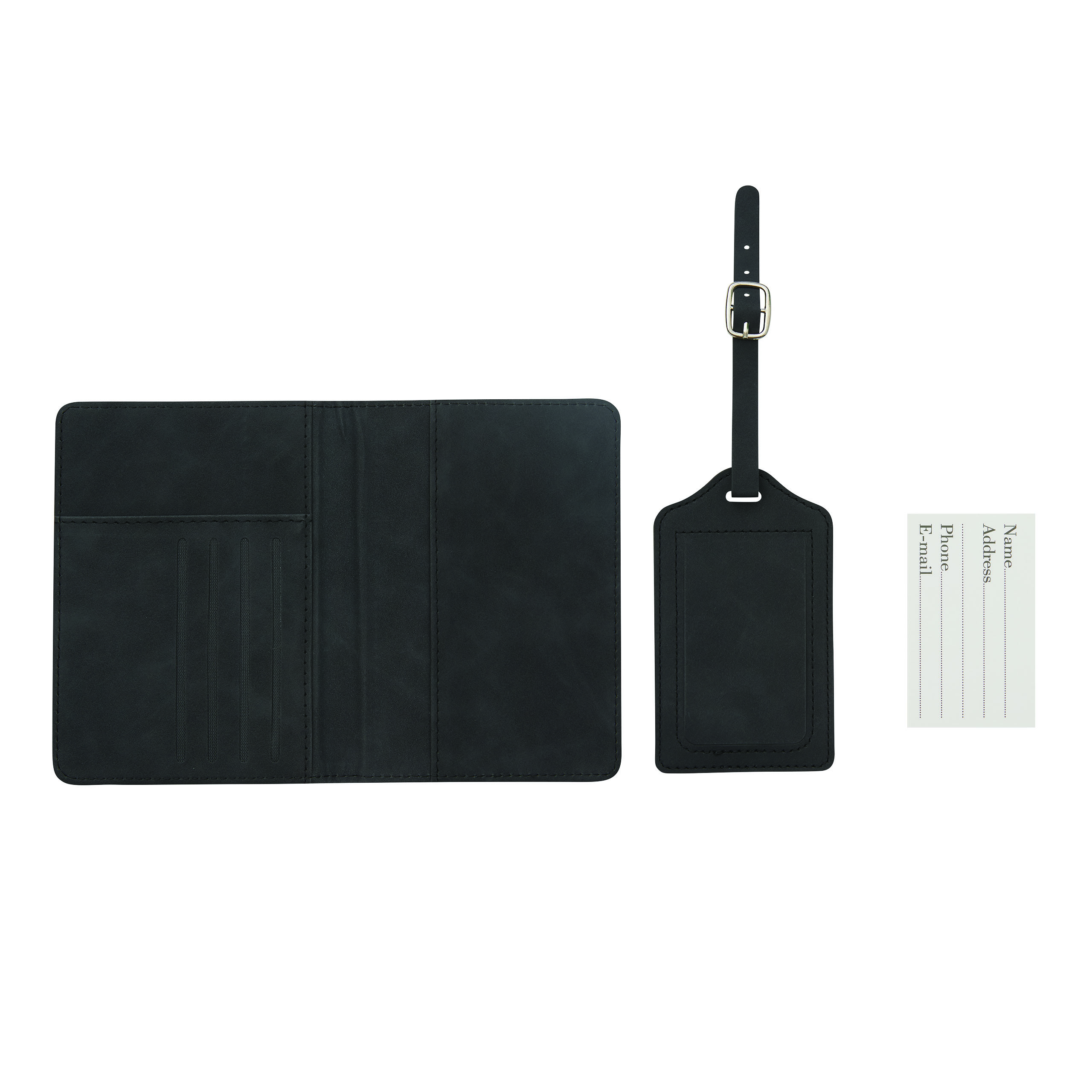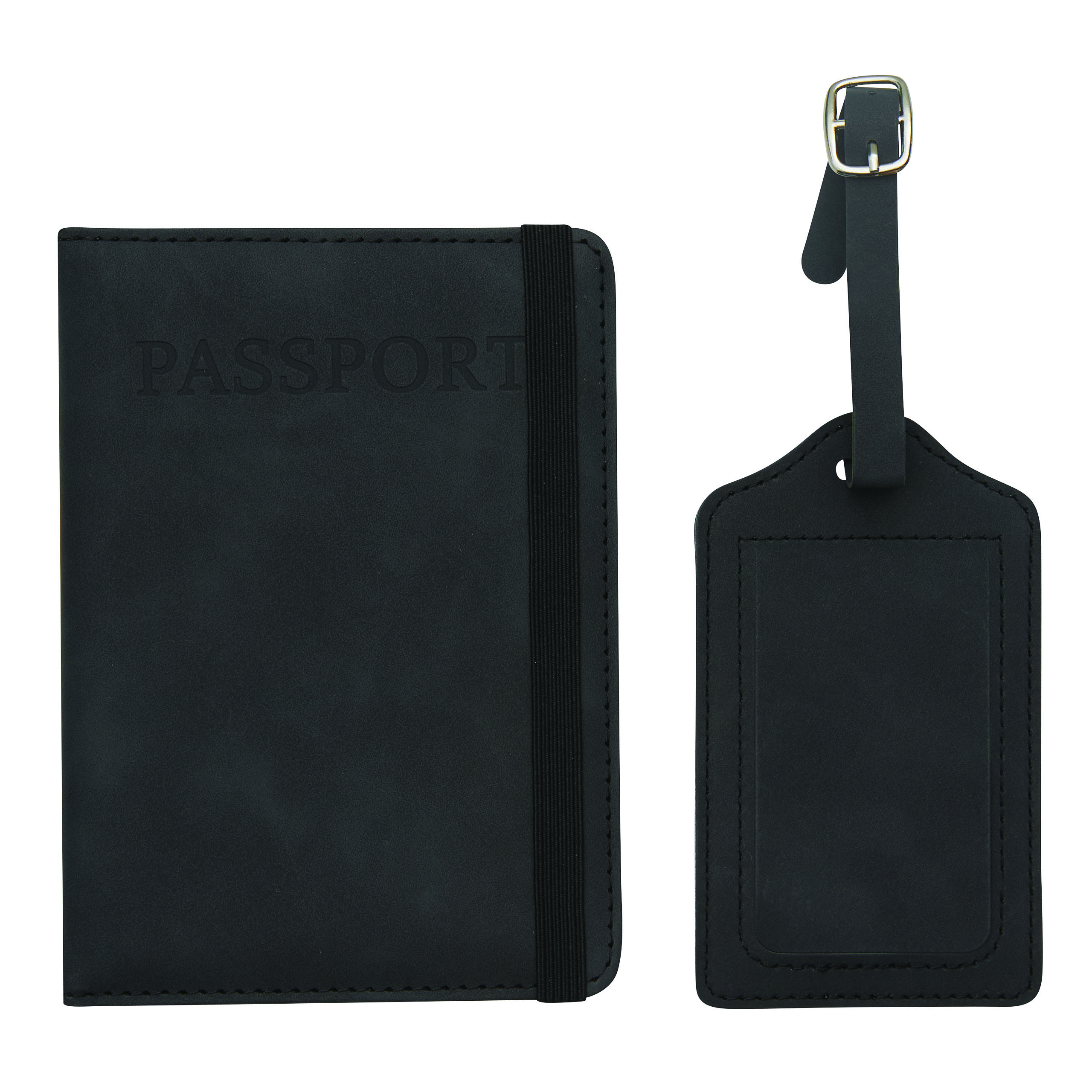 Reiseset VISA, 2-teilig: bestehend aus handlicher Reisepassbörse mit 4 Einsteckfächern für Geldkarten, 1 Fach für Bordkarten, 1 Fach für den Reisepass, mit Gummiband zum Verschließen und Kofferanhänger mit verdecktem Adressfeld und Anhängeband mit Schnalle, in Box