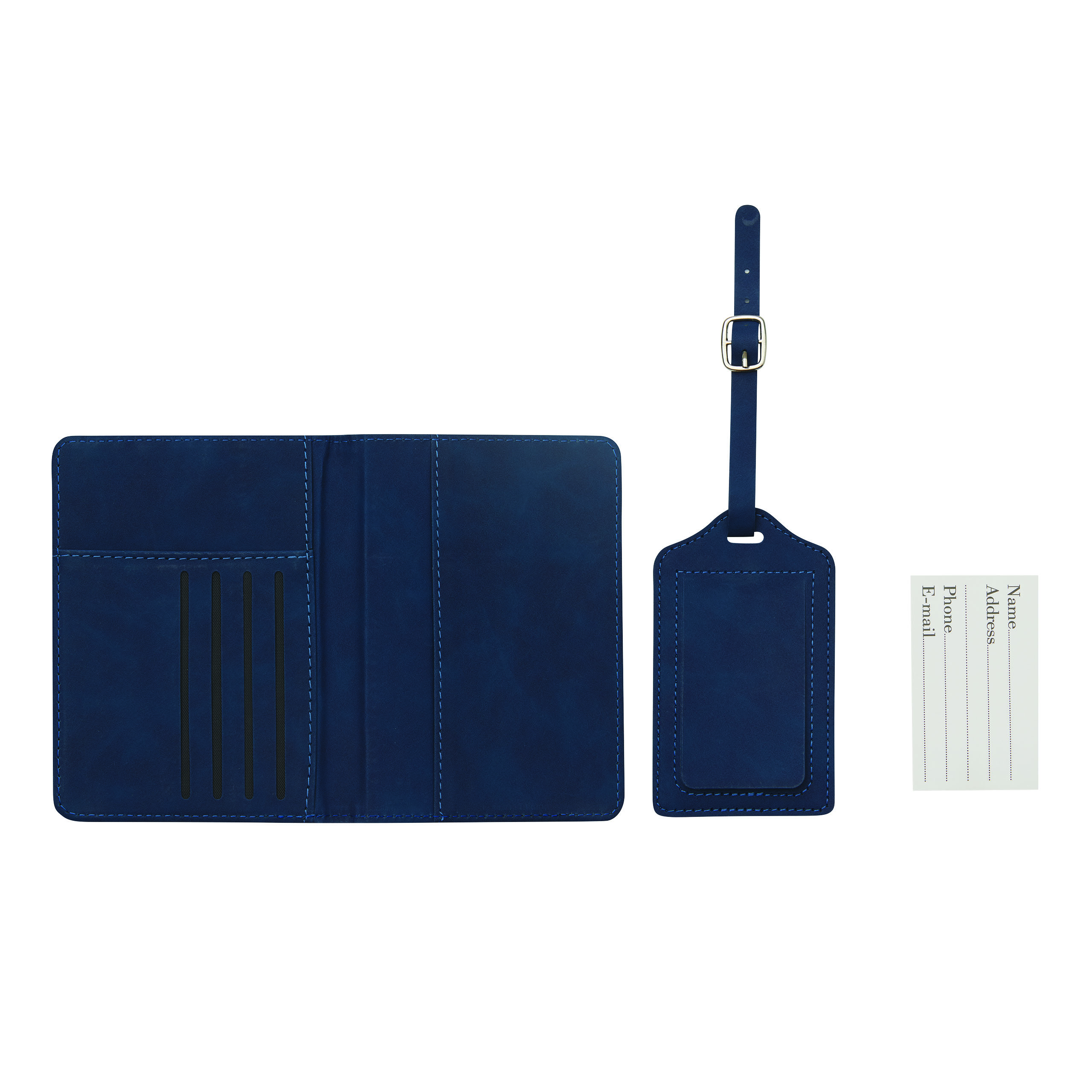 Reiseset VISA, 2-teilig: bestehend aus handlicher Reisepassbörse mit 4 Einsteckfächern für Geldkarten, 1 Fach für Bordkarten, 1 Fach für den Reisepass, mit Gummiband zum Verschließen und Kofferanhänger mit verdecktem Adressfeld und Anhängeband mit Schnalle, in Box