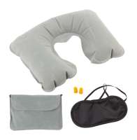 Reiseset mit aufblasbarem Nackenkissen, Schlafmaske und Ohrstöpsel. Lieferung in farblich abgestimmtem Samtetui.