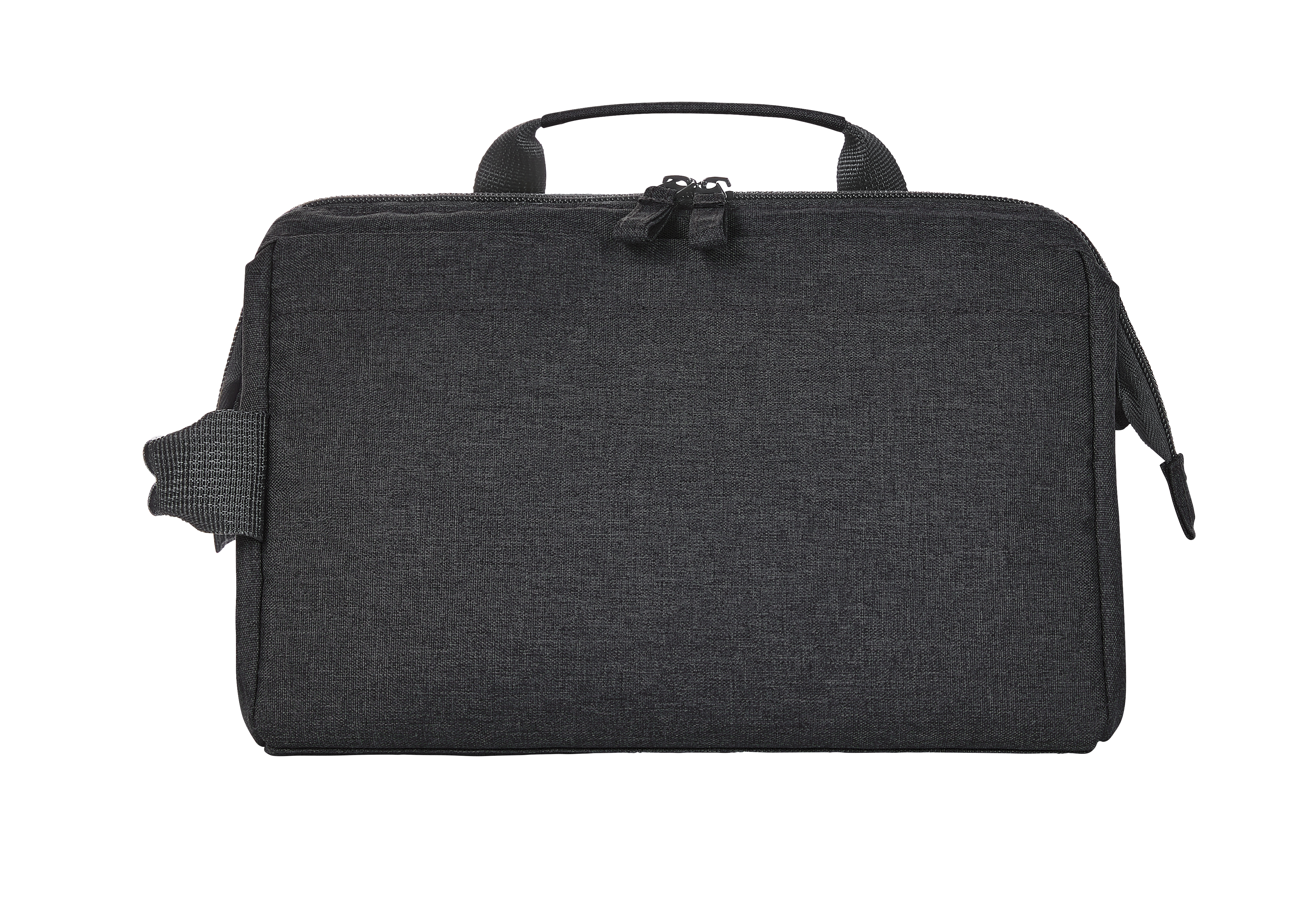 Formschöne Reißverschlusstasche mit stabiler Metallbügelöffnung zum Aufstellen oder -hängen; rPET-Obermaterial; großes, gepolstertes Hauptfach mit diversen Organizer-Elementen; Reißverschlussvortasche; Handgriff