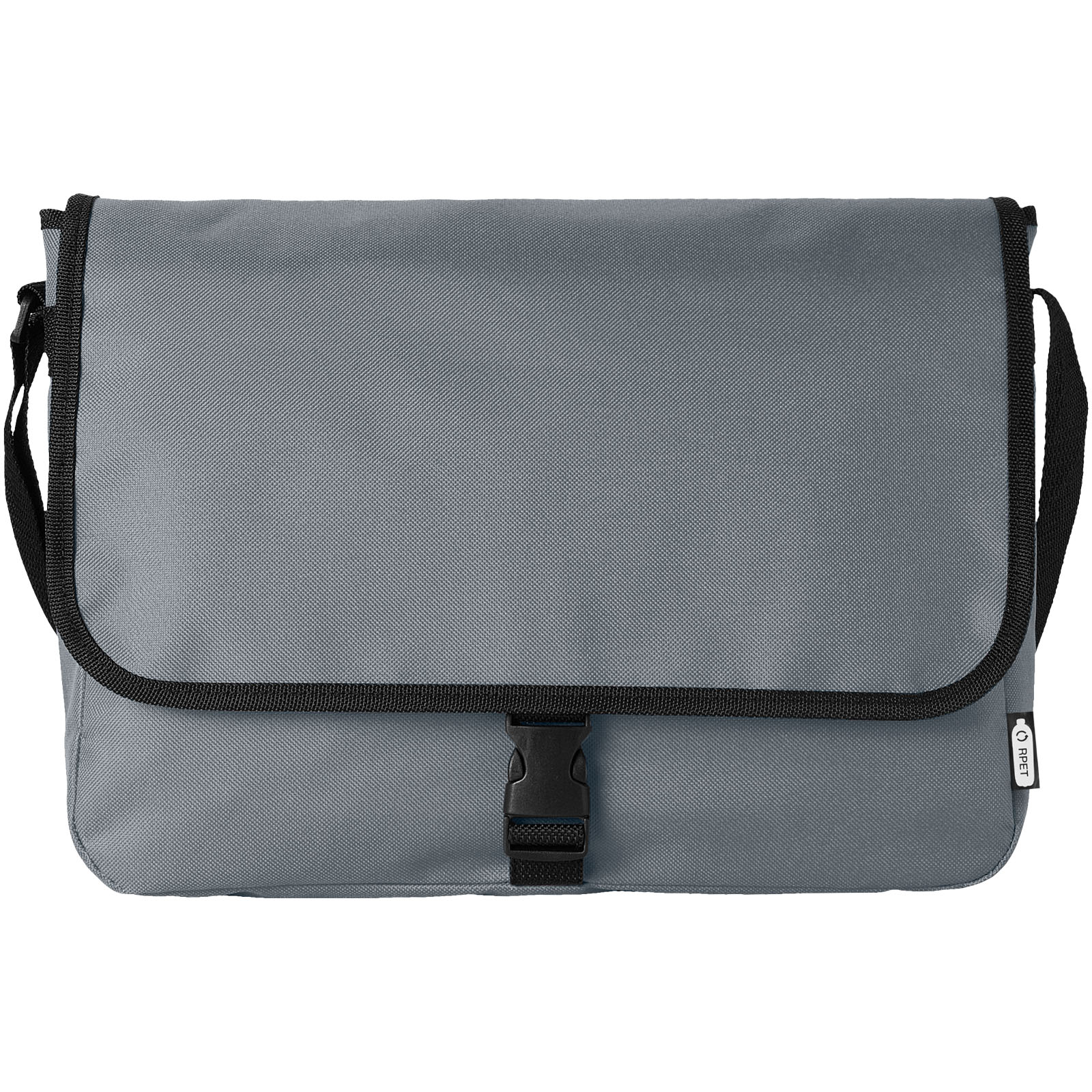 Umhängetasche aus recyceltem PET Kunststoff mit einem verstellbaren Schultergurt. Mit einem Hauptfach, das mit einer Klappe und einem Schnallenverschluss geschlossen wird.