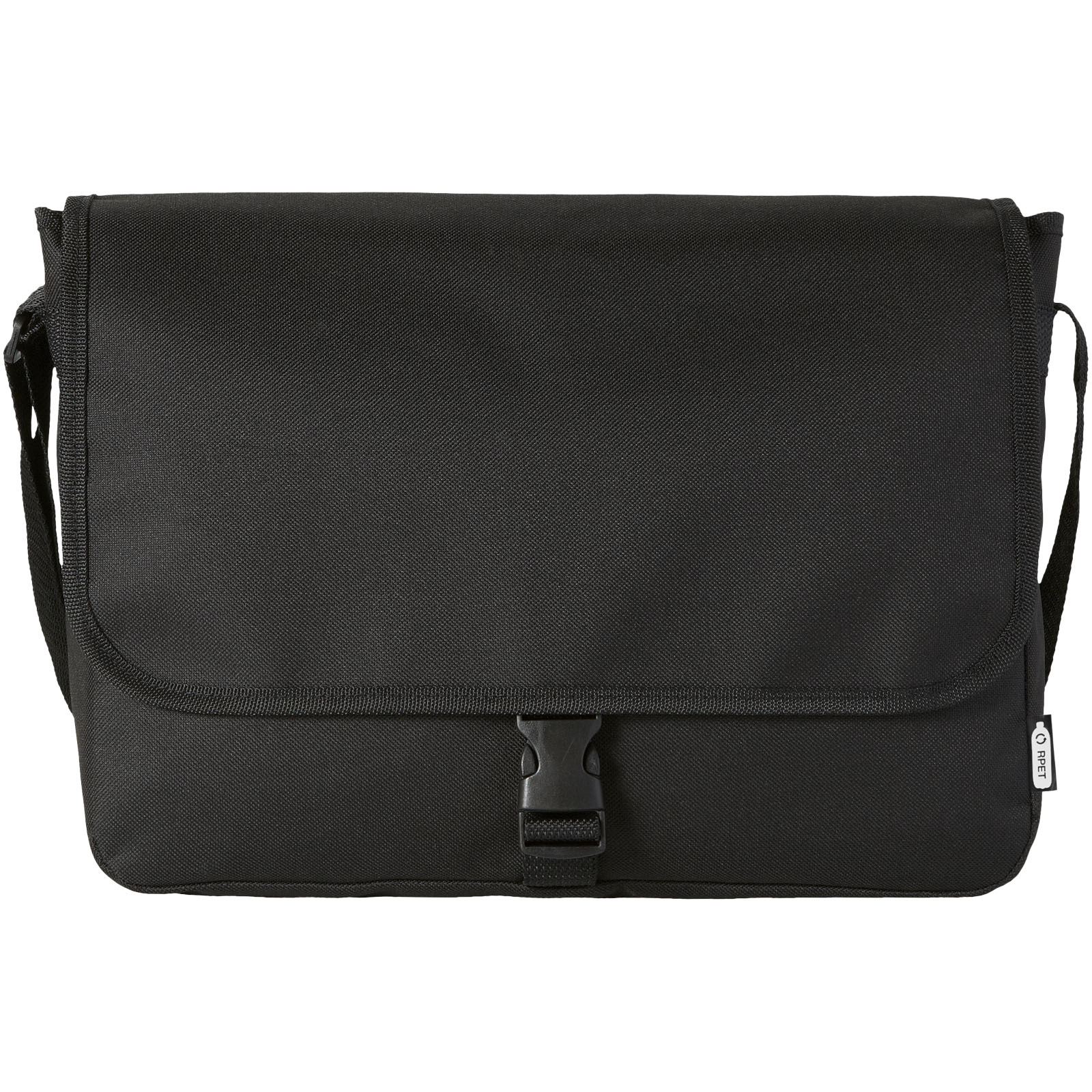 Umhängetasche aus recyceltem PET Kunststoff mit einem verstellbaren Schultergurt. Mit einem Hauptfach, das mit einer Klappe und einem Schnallenverschluss geschlossen wird.
