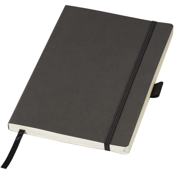 Flexibles Notizbuch mit weichem Einband (A5 Größen-Referenz) mit integriertem Gummiband-Verschluss, Lesezeichen-Bändchen, Stiftschlaufe, Dokumententasche an der inneren Rückseite und 80 Blatt (80 g / m²) cremefarbenem liniertem Papier. Verpackt in einer schwarzen Hülle.