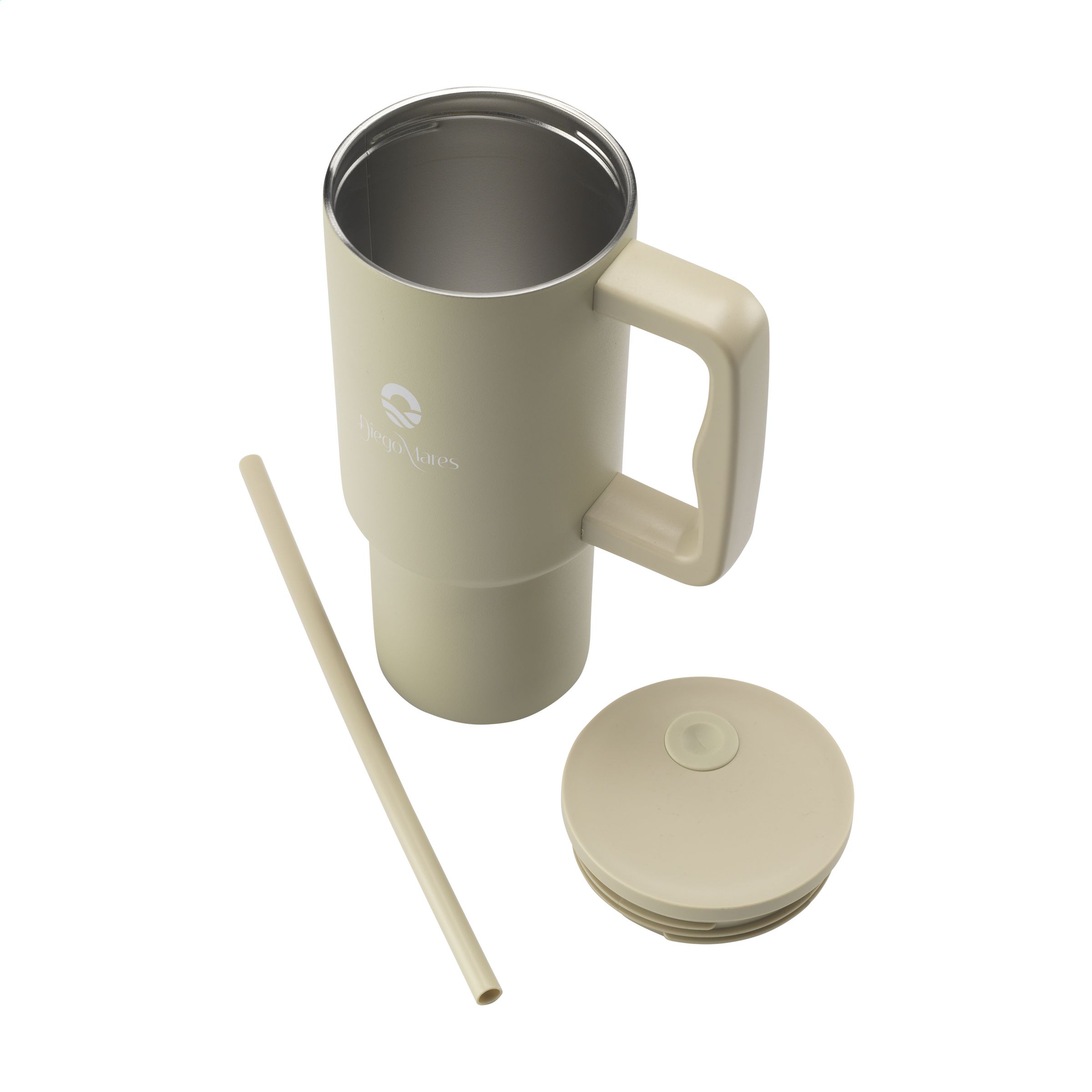 WoW! Großer, doppelwandiger Trinkbecher aus recyceltem Edelstahl mit Strohhalm. Der auffällige, robuste Becher hat einen großen Kunststoffgriff und einen Schraubdeckel mit einer Öffnung für den mitgelieferten Kunststoffstrohhalm. Dieser große Becher hält Getränke über längere Zeit auf Temperatur. Geeignet für kalte und heiße Getränke. Auch ohne Strohhalm geht die Temperatur dank der Silikondichtung im Deckel nicht verloren. Dieser Becher kann überall hin mitgenommen werden. Ideal für das Fitnessstudio oder das Büro. Dank des konischen, schmalen Bodens passt der Becher in fast jeden Becherhalter und ist somit perfekt für unterwegs. Nicht spülmaschinengeeignet. RCS-zertifiziert. Gesamtes recyceltes Material: 75%. Fassungsvermögen: 900 ml. Wird einzeln in einem Kraftkarton geliefert.