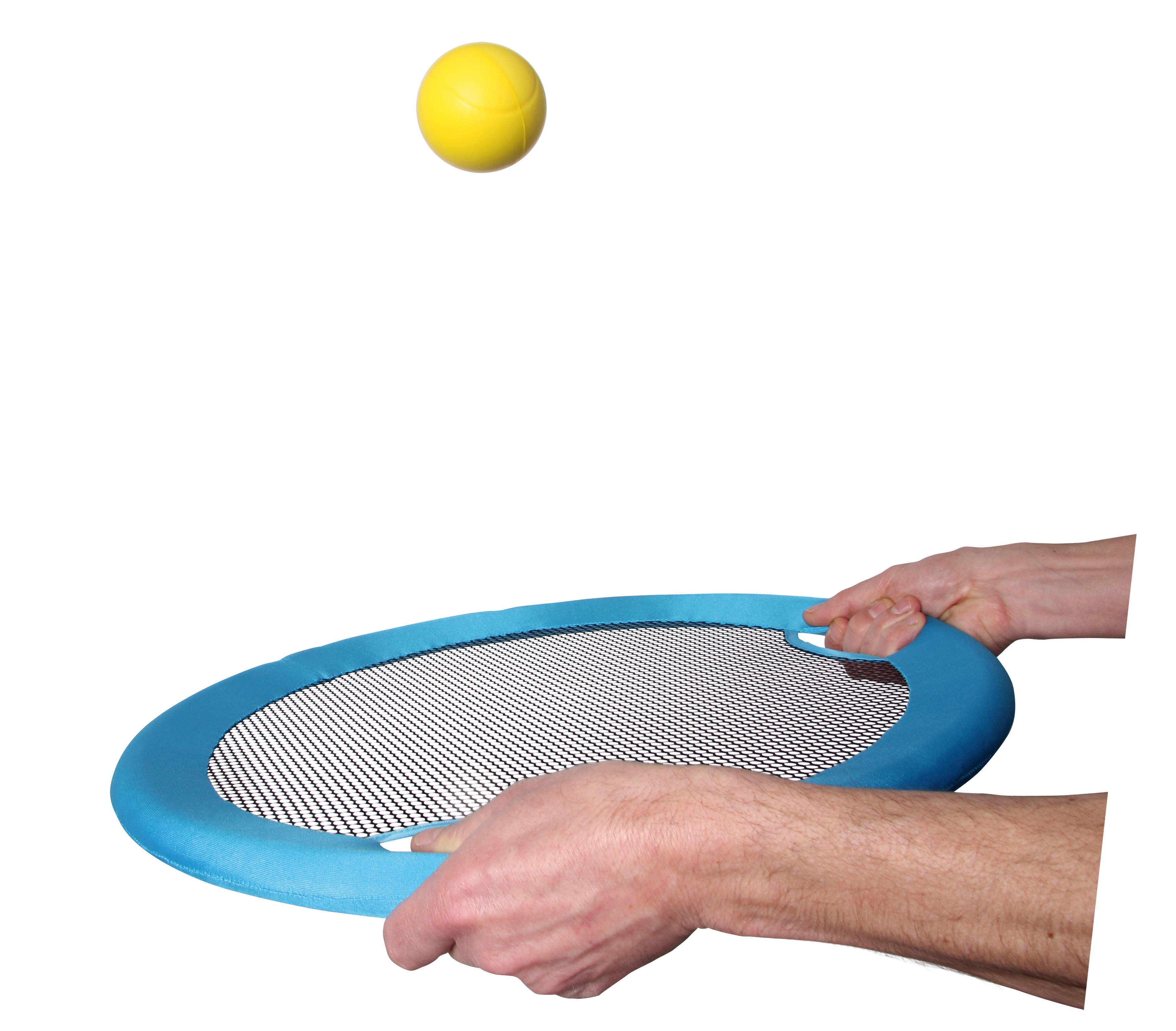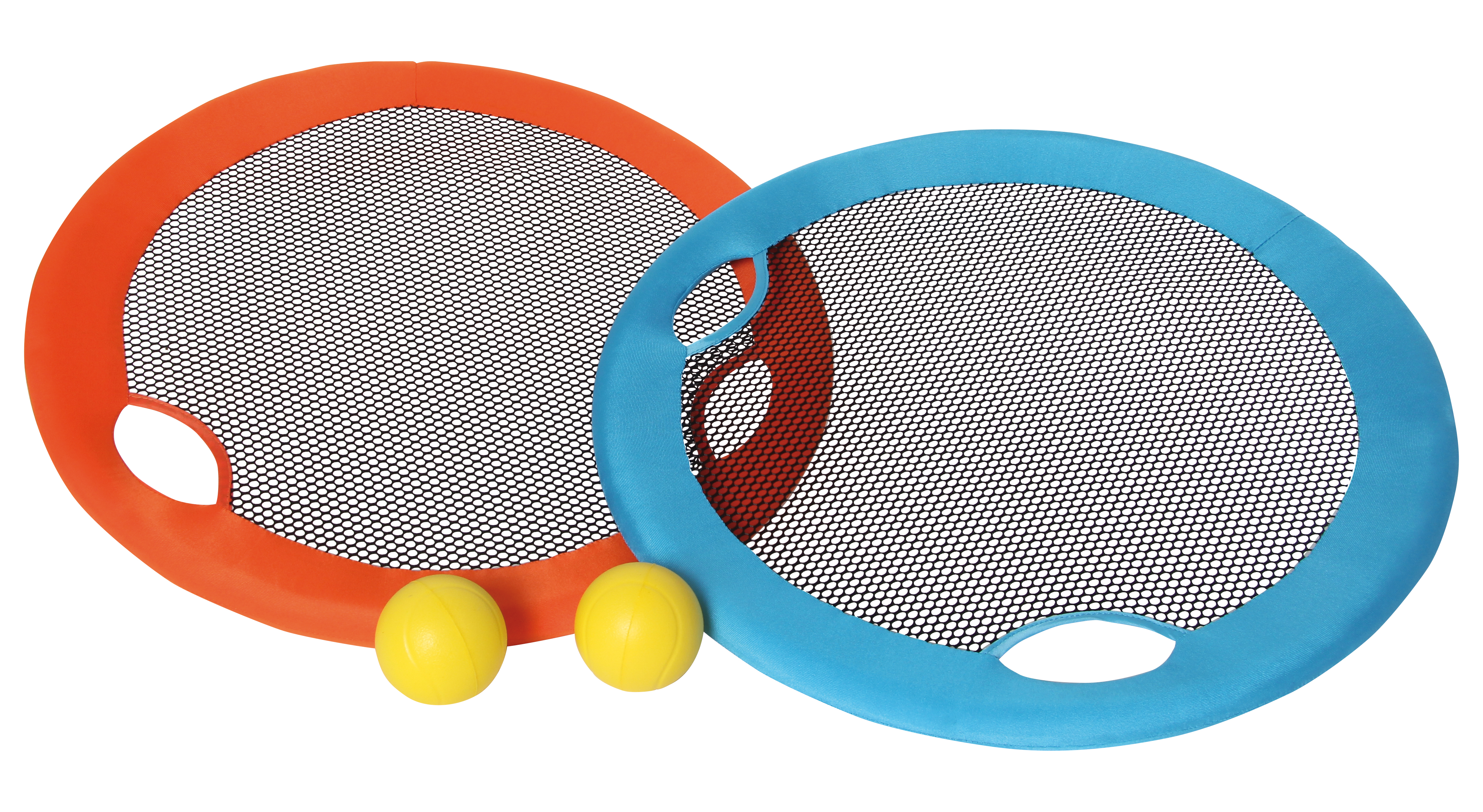 Action im XXL-Format! Die extra großen Schläger sind leicht und mit einem Textilgitter bespannt. Das Set besteht aus zwei runden Schlägern die mit beiden Händen gegriffen werden und zwei Softbällen.