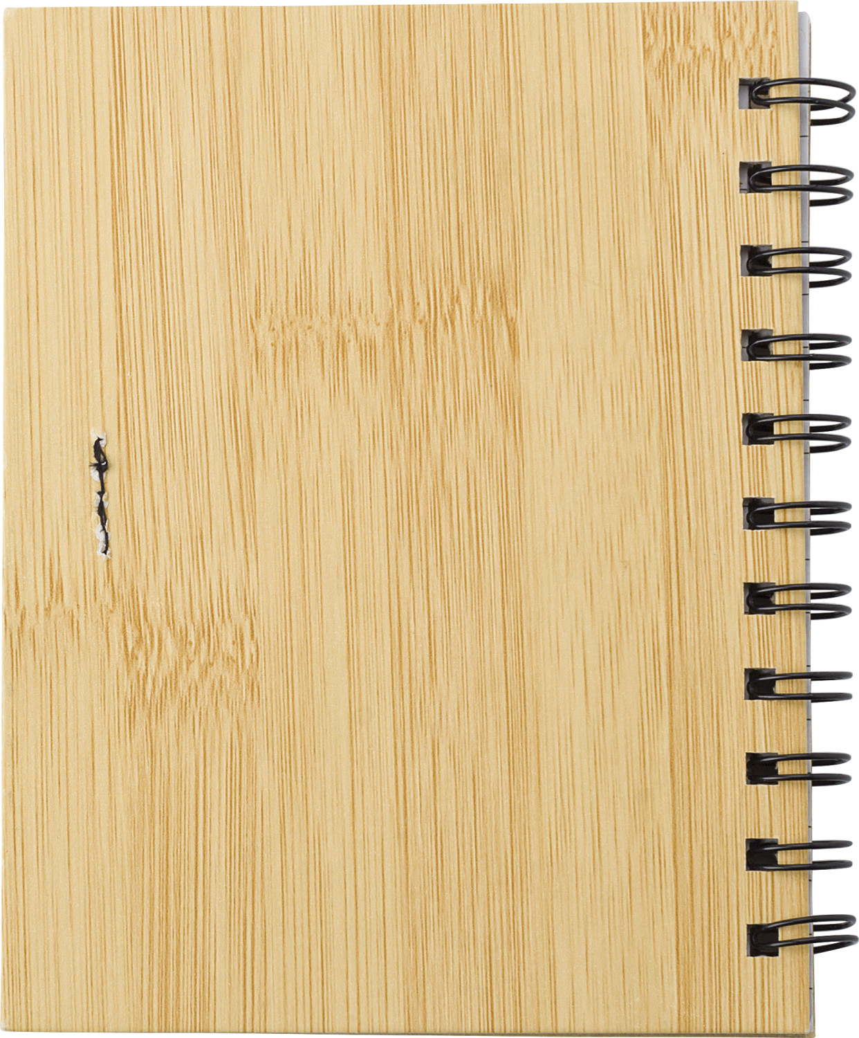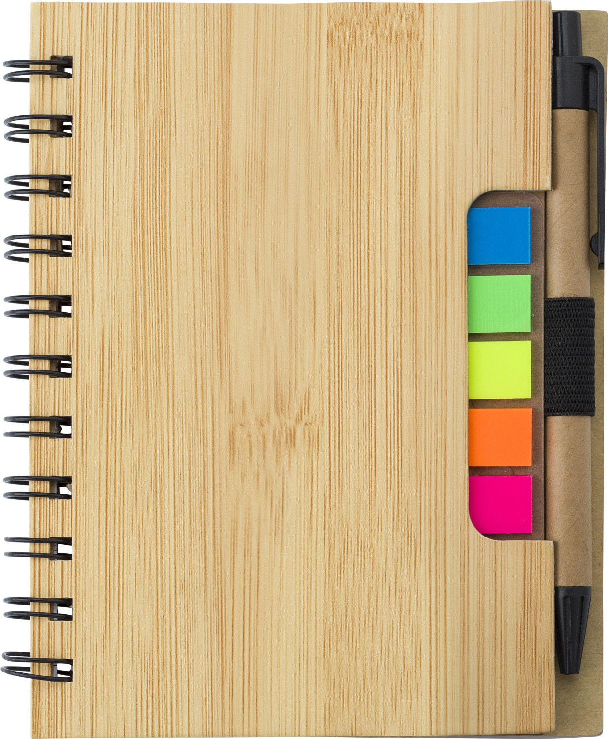 Ringbuch in Bambus-Optik mit 70 linierten Seiten und bunten Haftnotizen, inkl. Kugelschreiber mit blauer Mine.