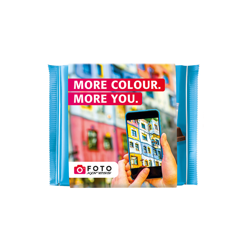 Ritter SPORT Schokolade 100 g in Werbeschuber aus weißemKarton, individuell bedruckt. Inhalt: 1 RItter SPORT Schokoladentafel Alpenmilch (nur sortenrein im Karton), 100 g