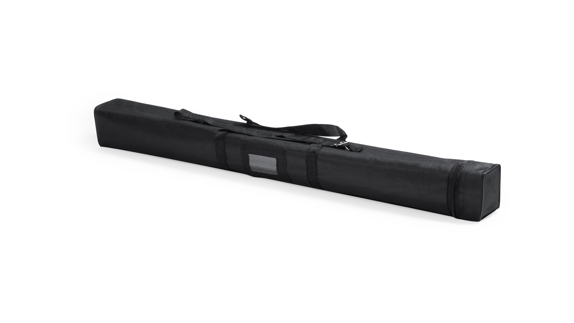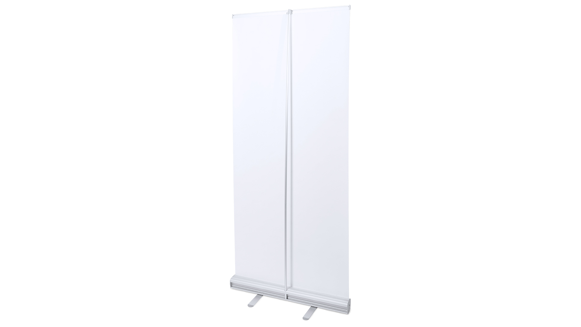Roll-up-Ständer aus Aluminium. Inklusive Befestigungshaken und Aluminiumhalterungen. Geeignet für eine Plane mit den Maßen 85 x 200 cm (hochdichte Polypropylenplane, im Druckauftrag enthalten). Lieferung in einer Polyestertragetasche mit Griffen für einen bequemen Transport.