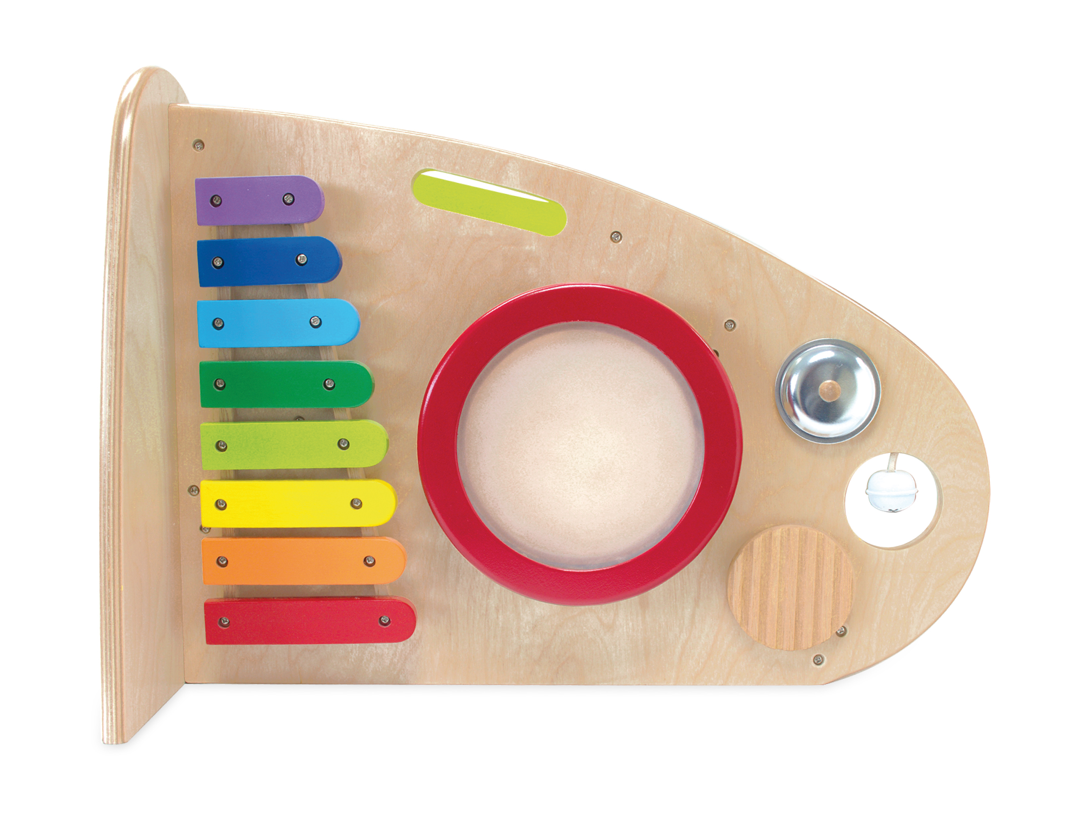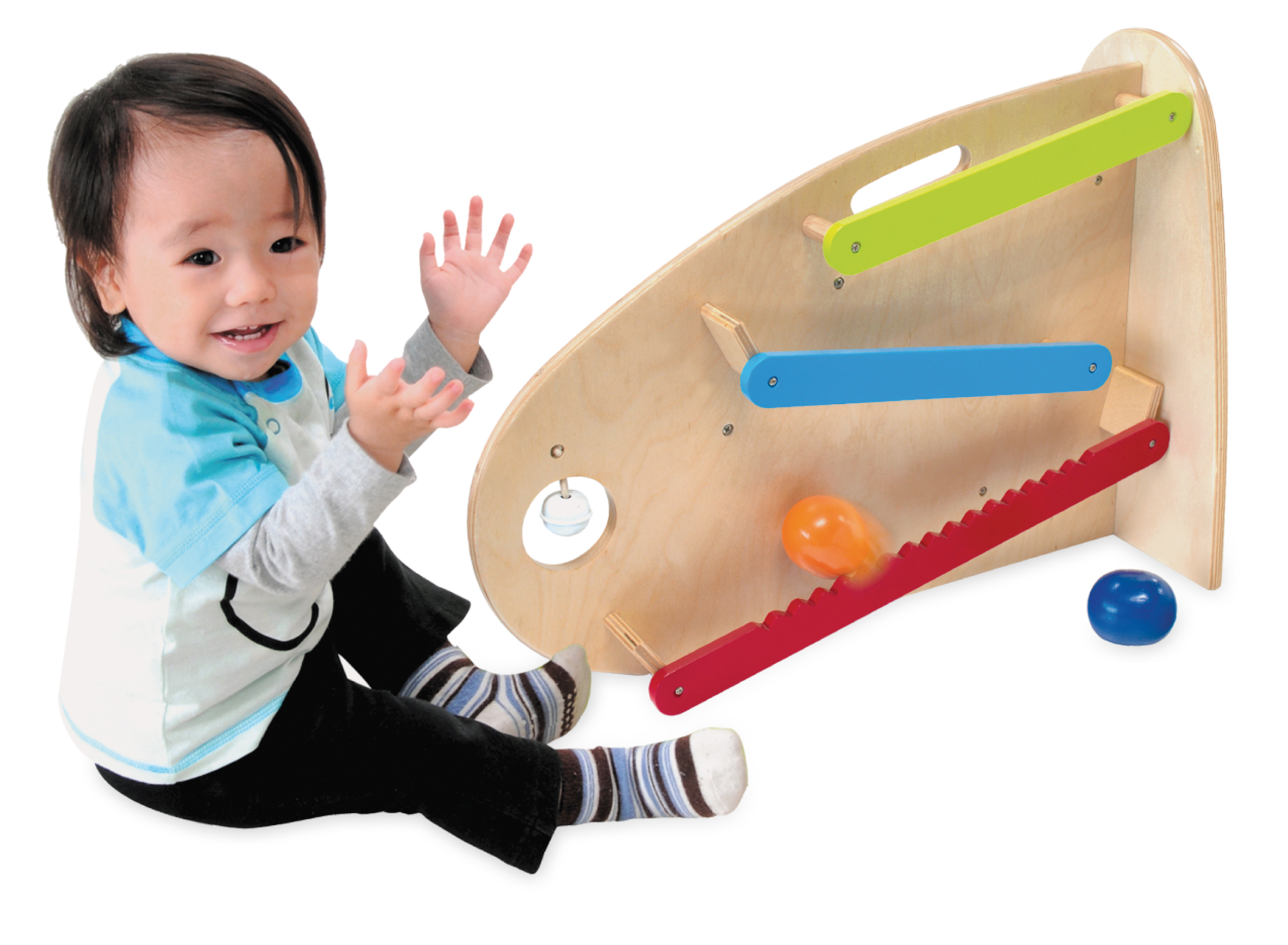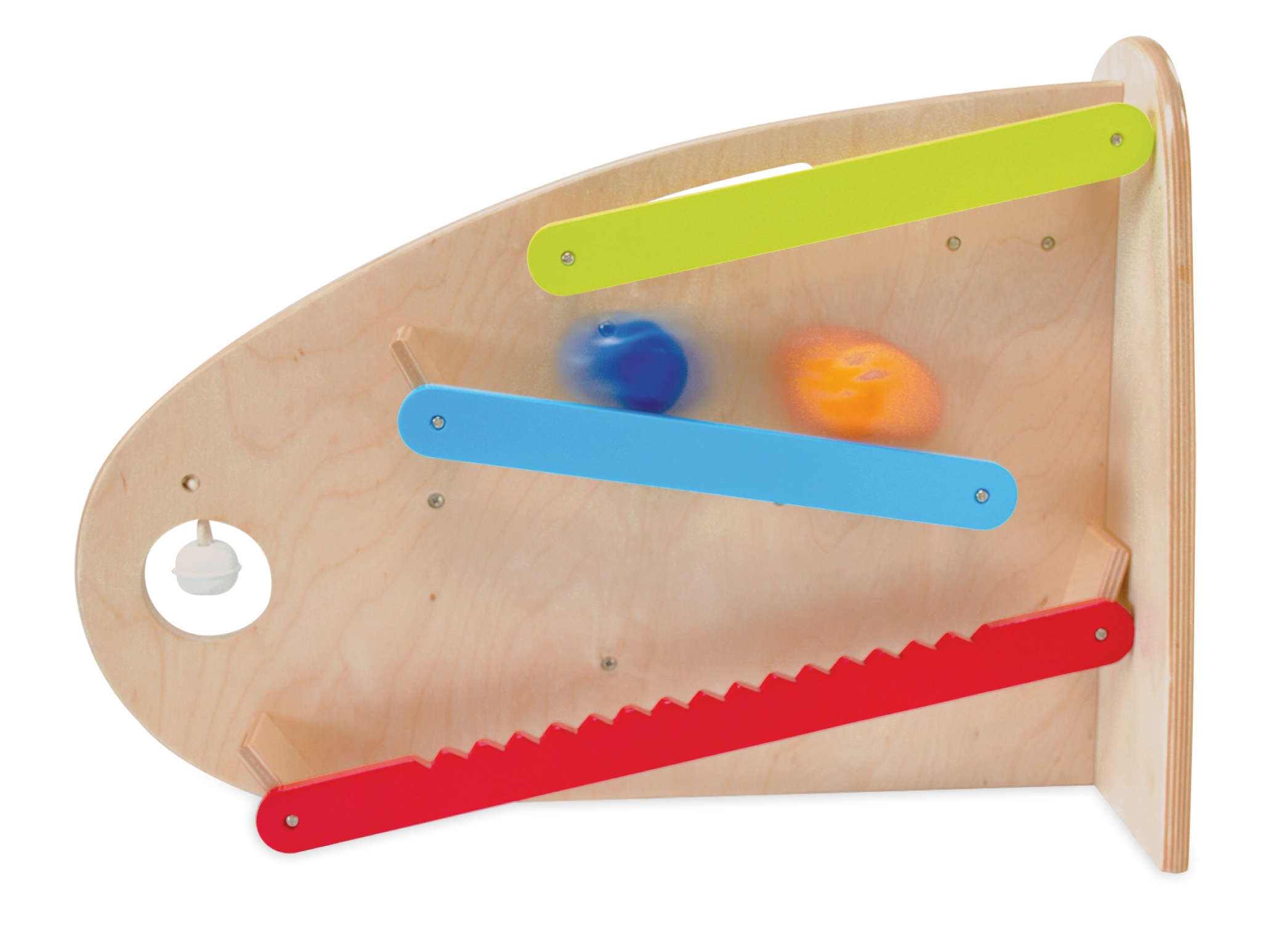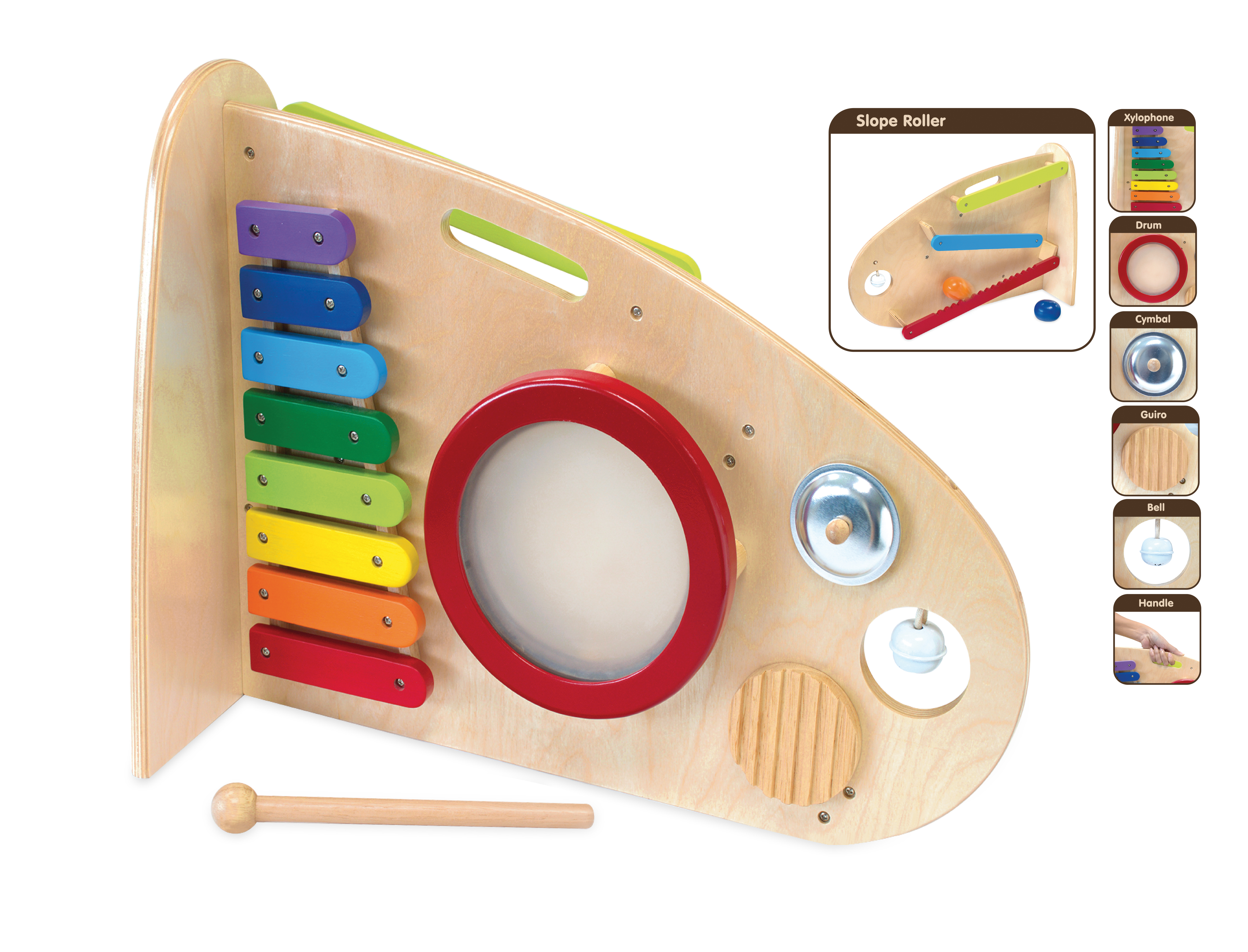 Vielseitiges Spielgerät aus Holz mit origineller Kugelbahn, eiförmigen Klackerkugeln und musikalischer Rückseite mit Xylophon, Trommel, Schelle, Glöckchen und Riffelscheibe.