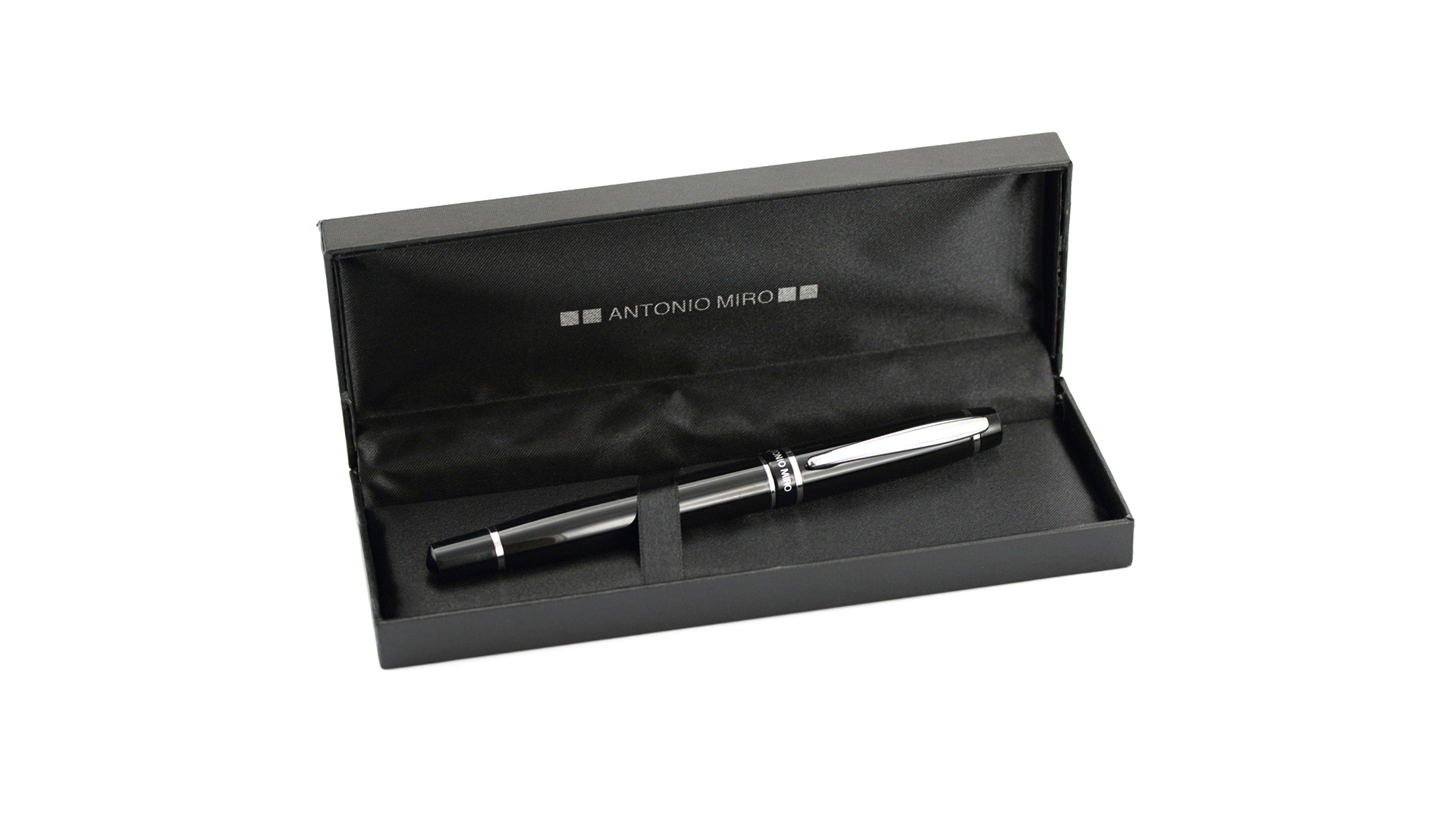 Tintenroller von Antonio Miró mit elegantem, zweifarbigem Design und geschmeidigem Metallschaft in schlichtem Schwarz. Mit dem Markenlogo unterhalb des Rings sowie Clip und Spitze in glänzendem Silber. Präsentiert in einer individuellen Schachtel in Schwarz mit dem Markenlogo. Blaue Tinte.