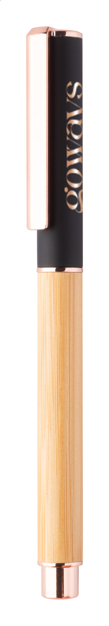 Tintenroller aus Bambus und recyceltem Aluminium mit gummierter Kappe und roségoldenen Elementen. Mit Spezialbeschichtung für Spiegelgravur in Roségold, blauschreibend.